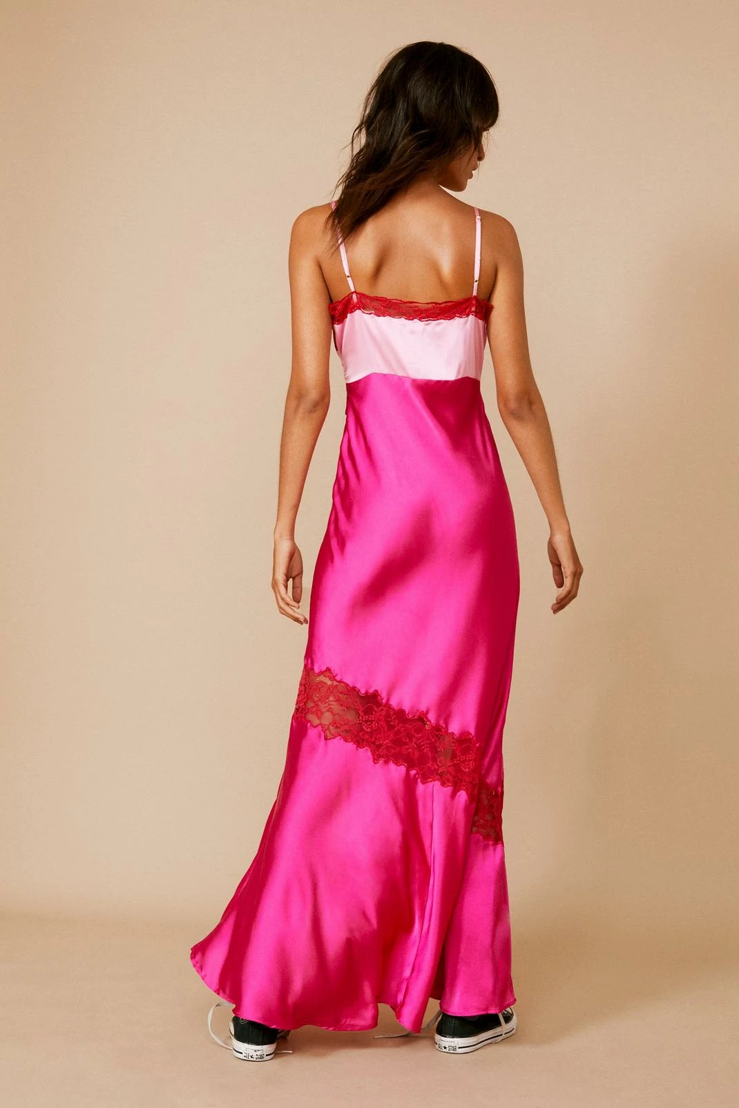 Loving lace. Feel femme and flirty in our maxi slip dress, in a high quality satin fabric, with lace detailing, a thigh high leg split, and ultra flattering slip design. Pairs well with strappy heels for a look that will take you from dinner dates to sipping cocktails.