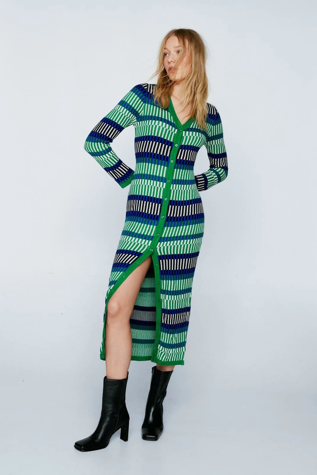 Stripe out. Feel ready to seize the day in our midi dress, with a classic stripe pattern, button front fastening, high quality knit fabric, and a flattering fit and flare design. Pairs well with chunky boots for an elevated look that will take you seamlessly from day to night, whether you’re heading to the office, brunch, or for dinner and drinks.