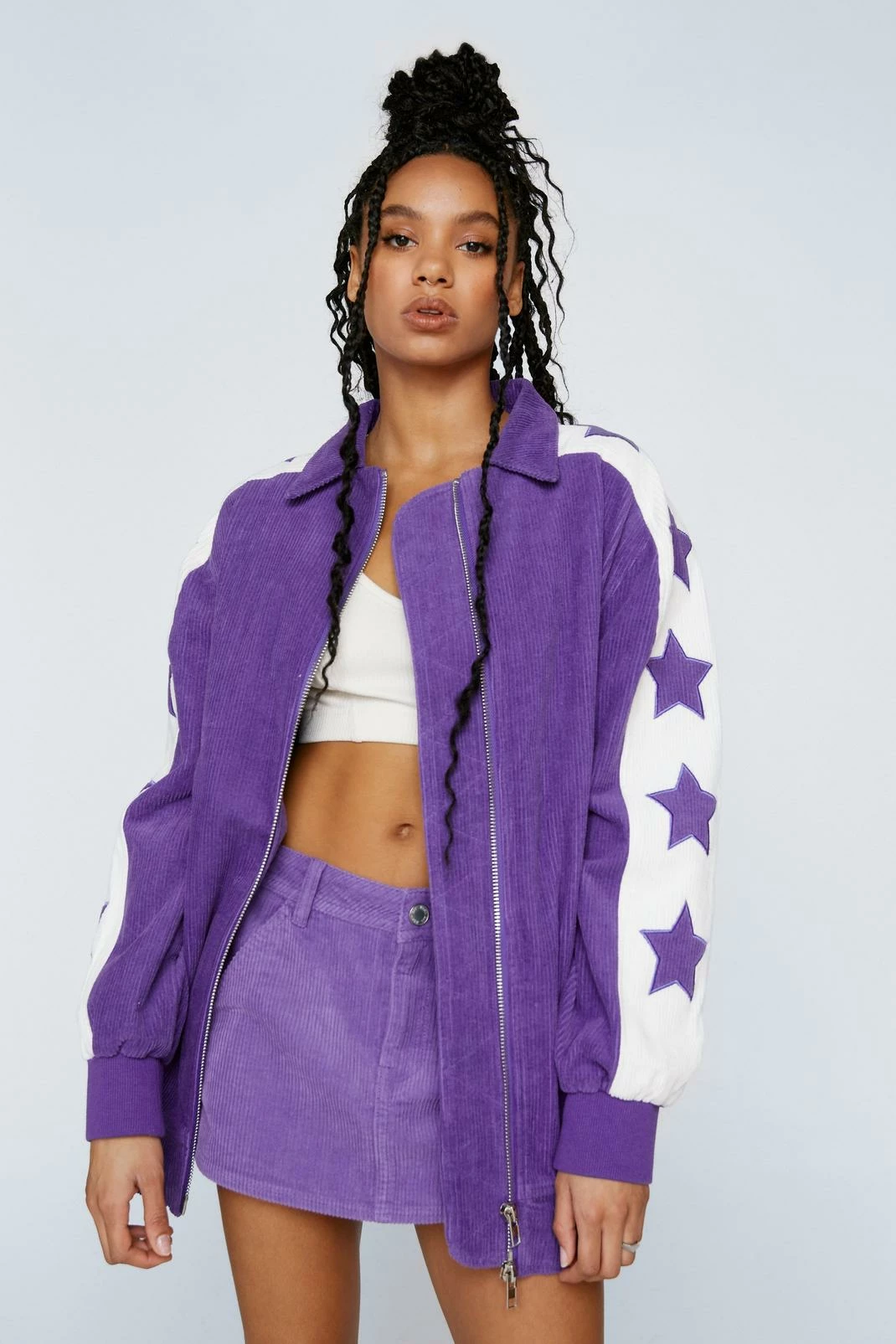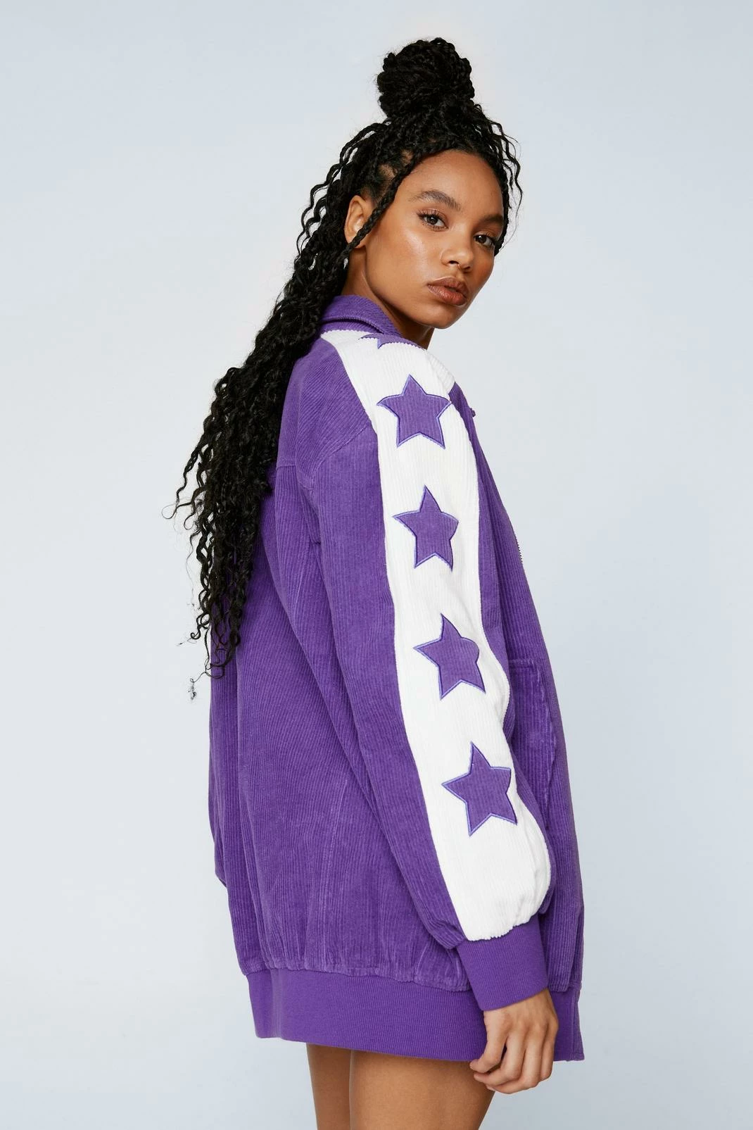 Add a layer. Feel ready for the day when you throw on our bomber jacket, made in a high quality corduroy fabric, with star detailing on the sleeves, and an ultra comfortable ovresized fit. Pairs well with your fave daytime looks for a pop of color in your closet.