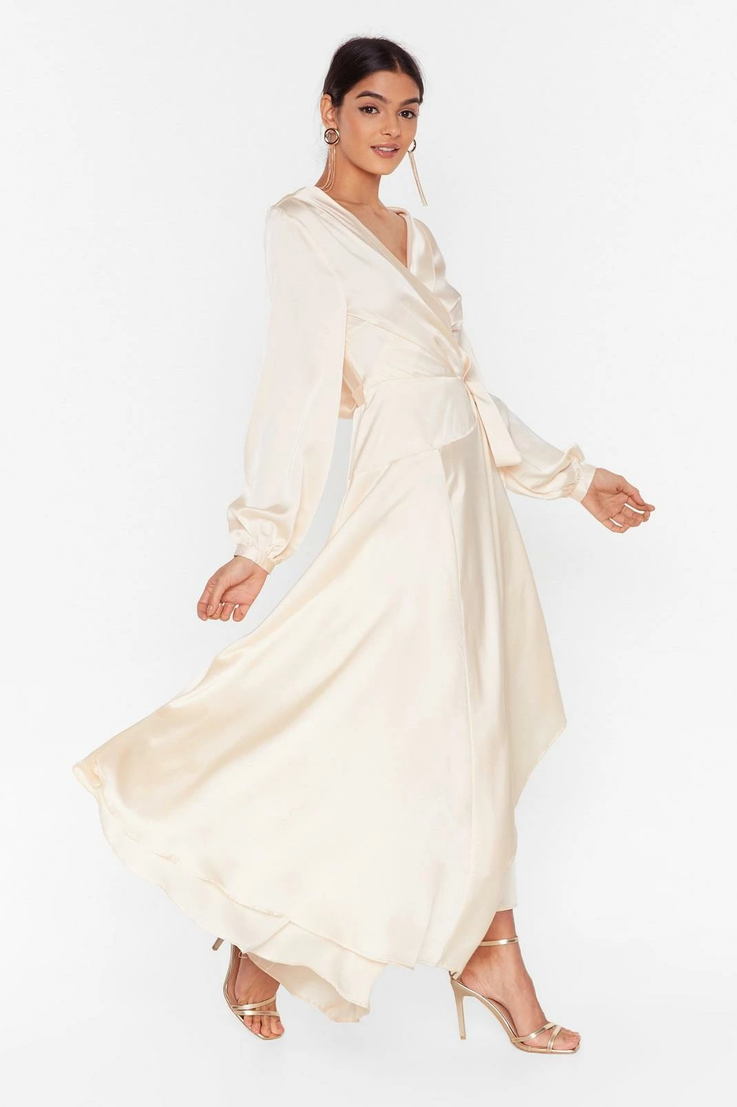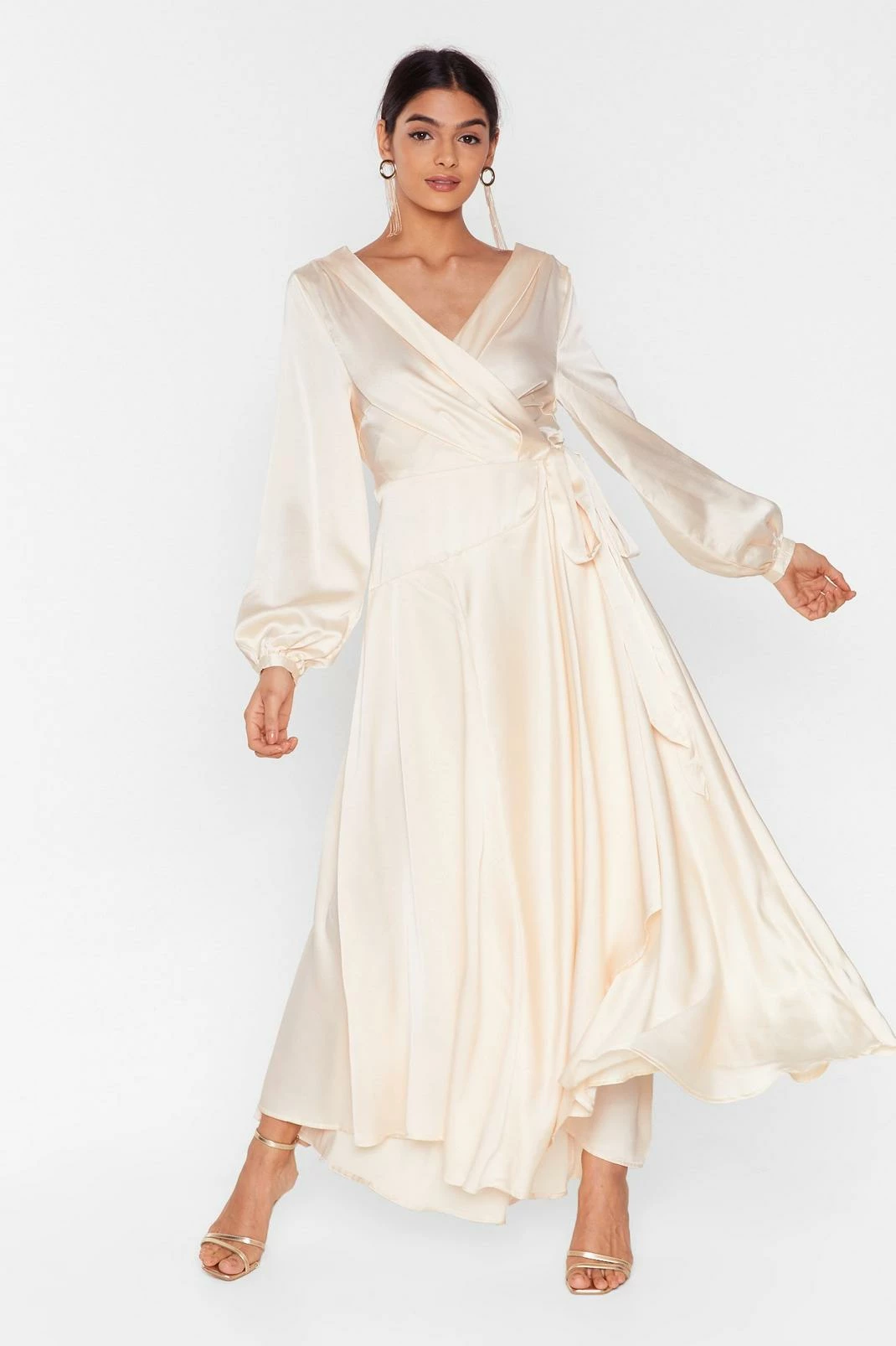 Or don’t. This dress comes in satin and features a wrap design, tie closure at side, maxi silhouette, and pleats at skirt.
