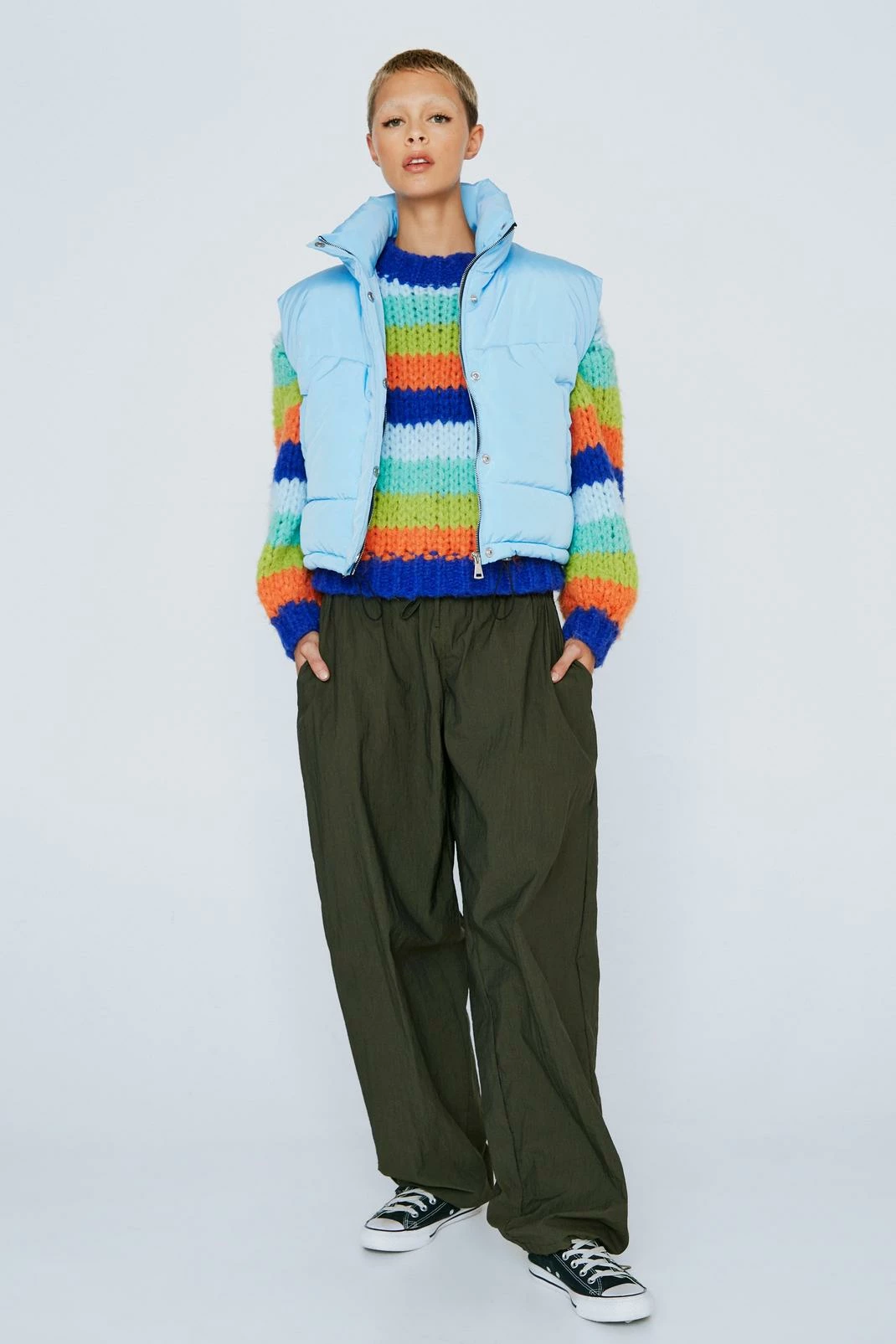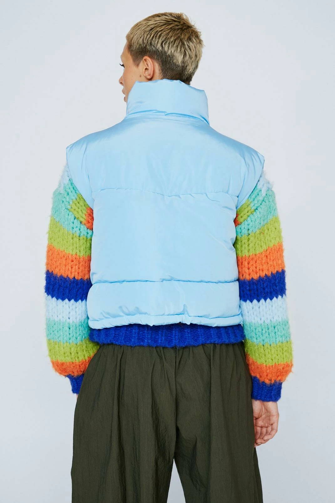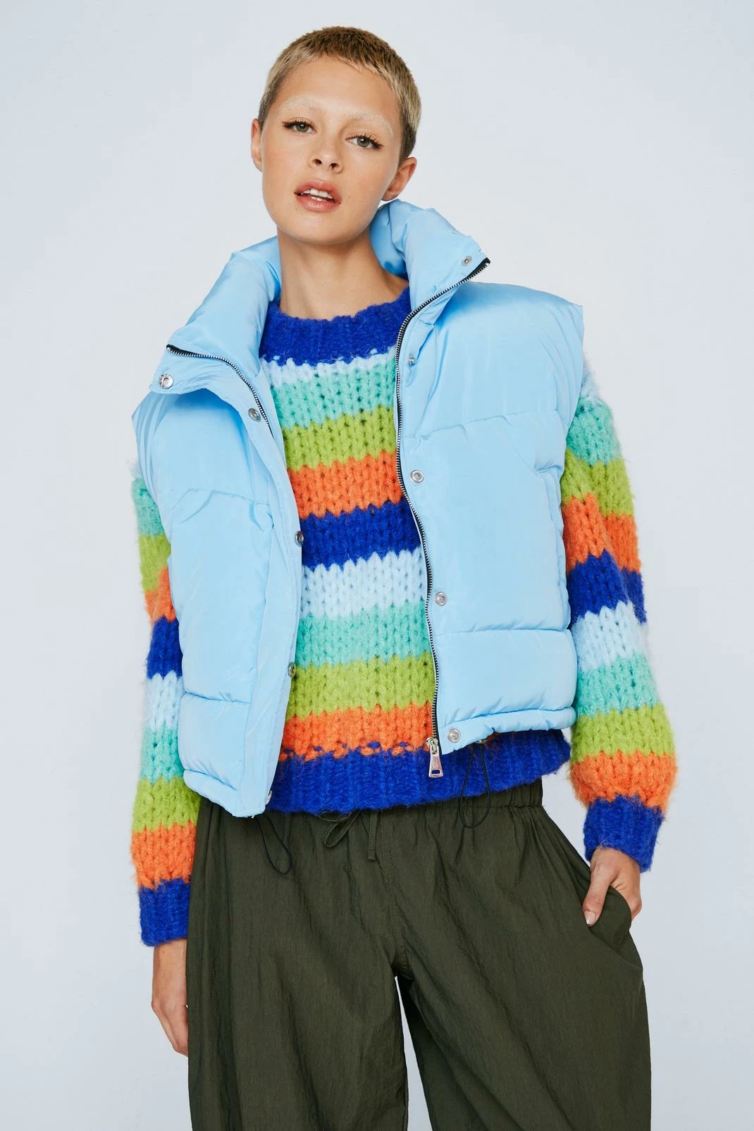 Add a layer. Feel cozy in our puffer vest, made in ultra thick padded fabric, with a zip and popper button fastening for extra protection from the elements, and a fun cropped length. Pairs well with sweaters and cargo pants for a cold day out look, perfect for wintery walks and coffee runs.