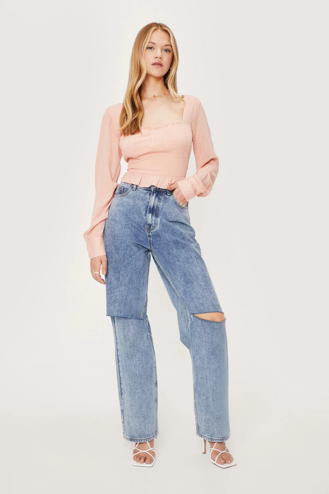 Cup to no good. This top features a cropped silhouette, square neckline, blouson sleeves, cupped design, textured spotty design, and ruffled detailing at neckline. For your next social thing, style with split hem jeans, faux leather stiletto heels, and a hella cute shoulder bag.