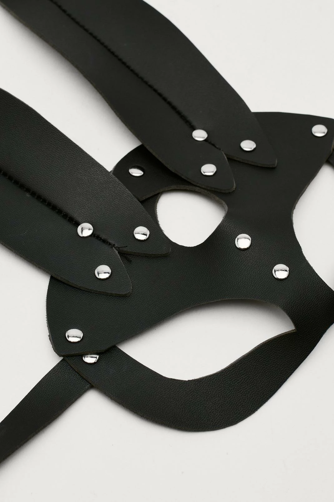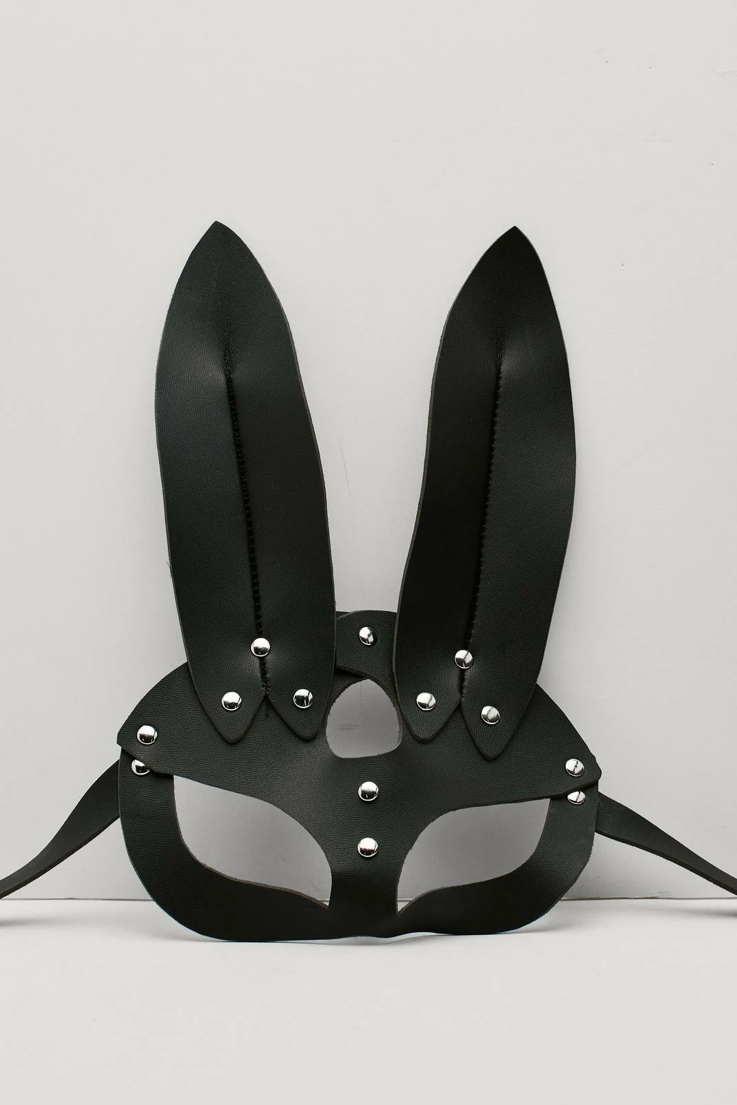 Costume calling. This mask comes in faux leather and features a bunny design and studded detailing. Throw on with an all black outfit and your costume is good to go.