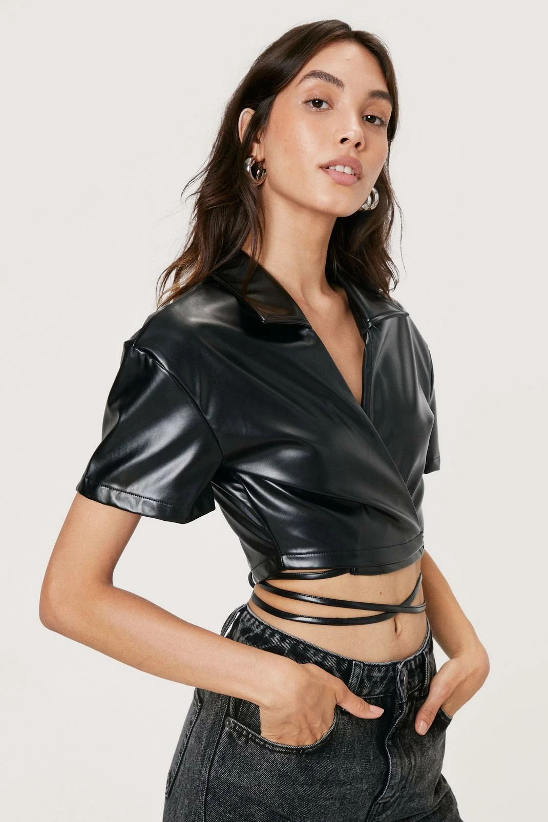 - Style: Faux Leather Wrap Wide Sleeve Crop Top