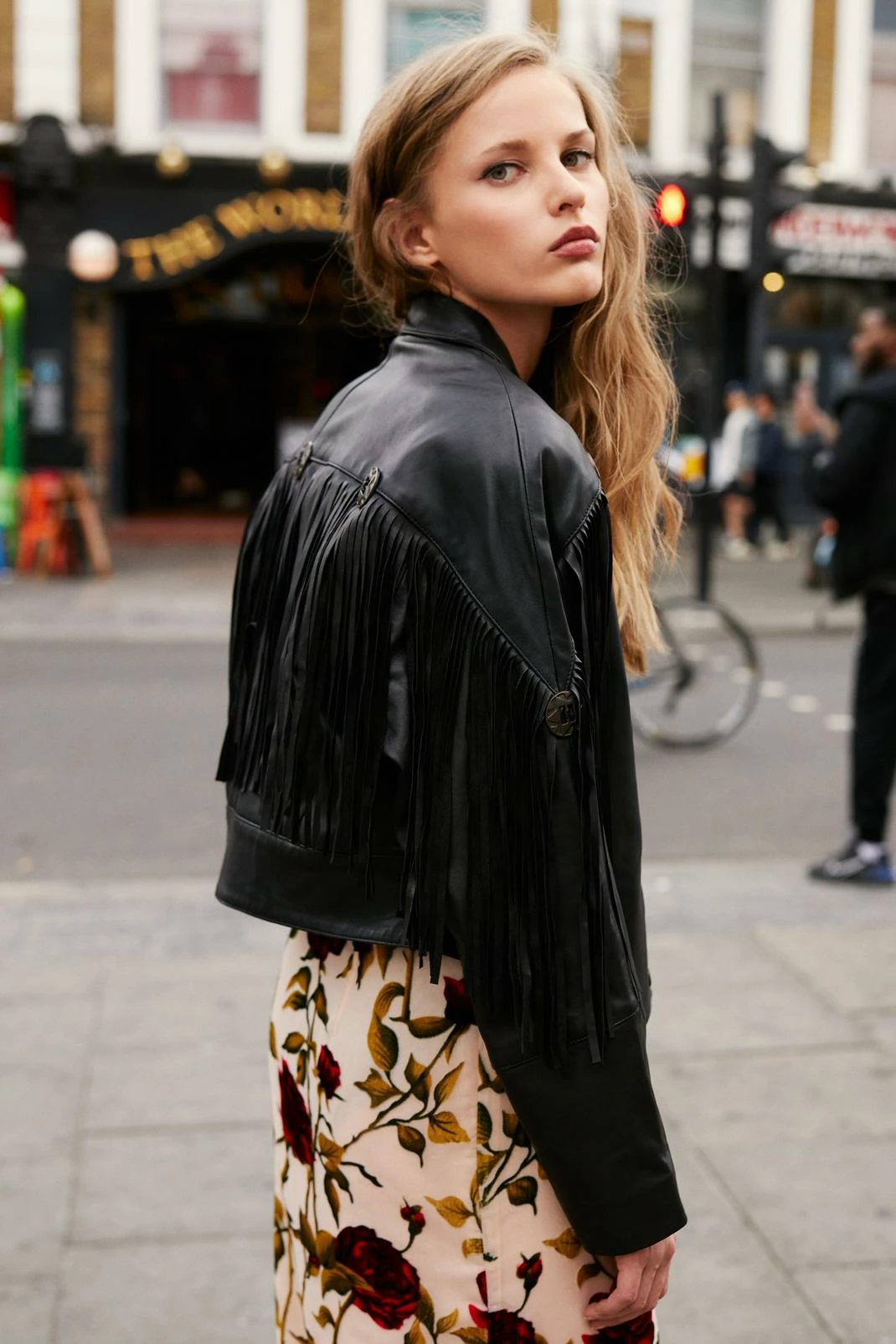 - A staple with some sass. Real leather jacket with fringe detailing.