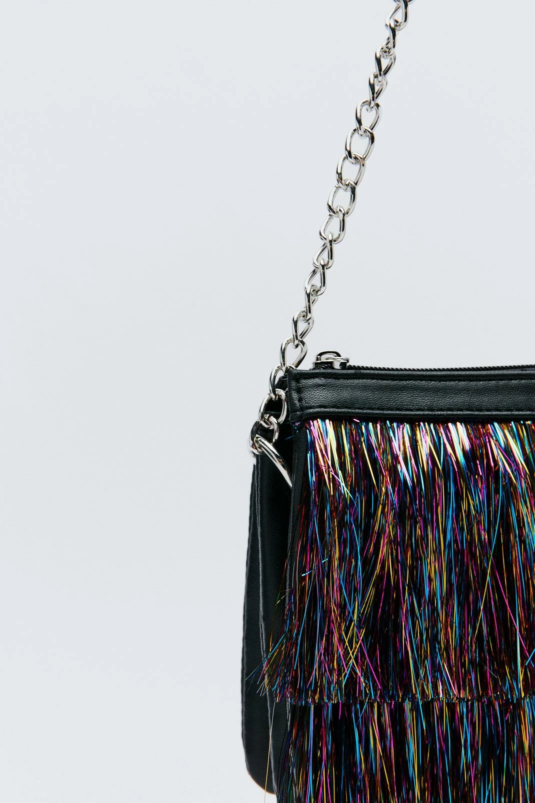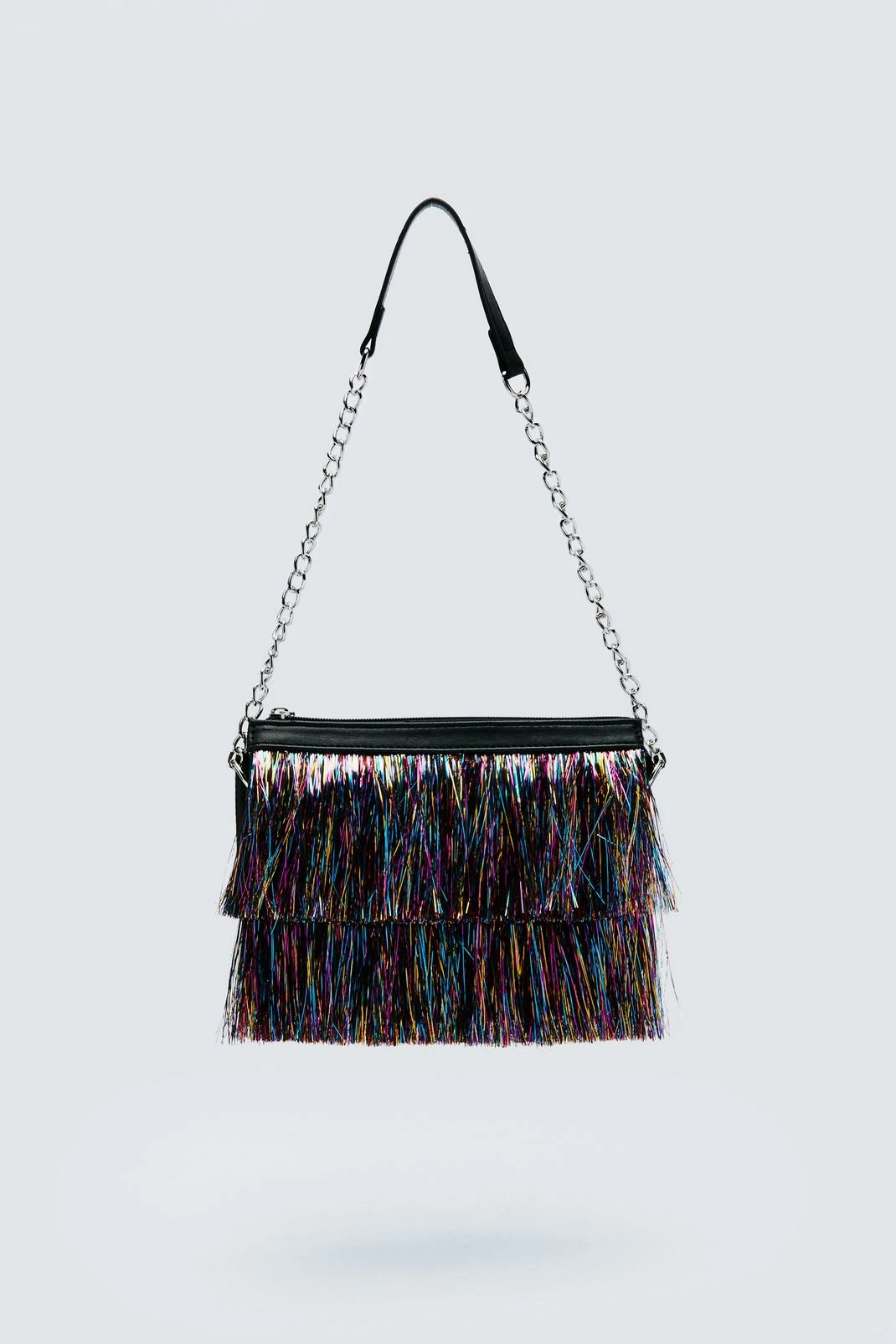 Party time. Add movement and color to your look with our fun tassel bag, perfect for holding your night out essentials.