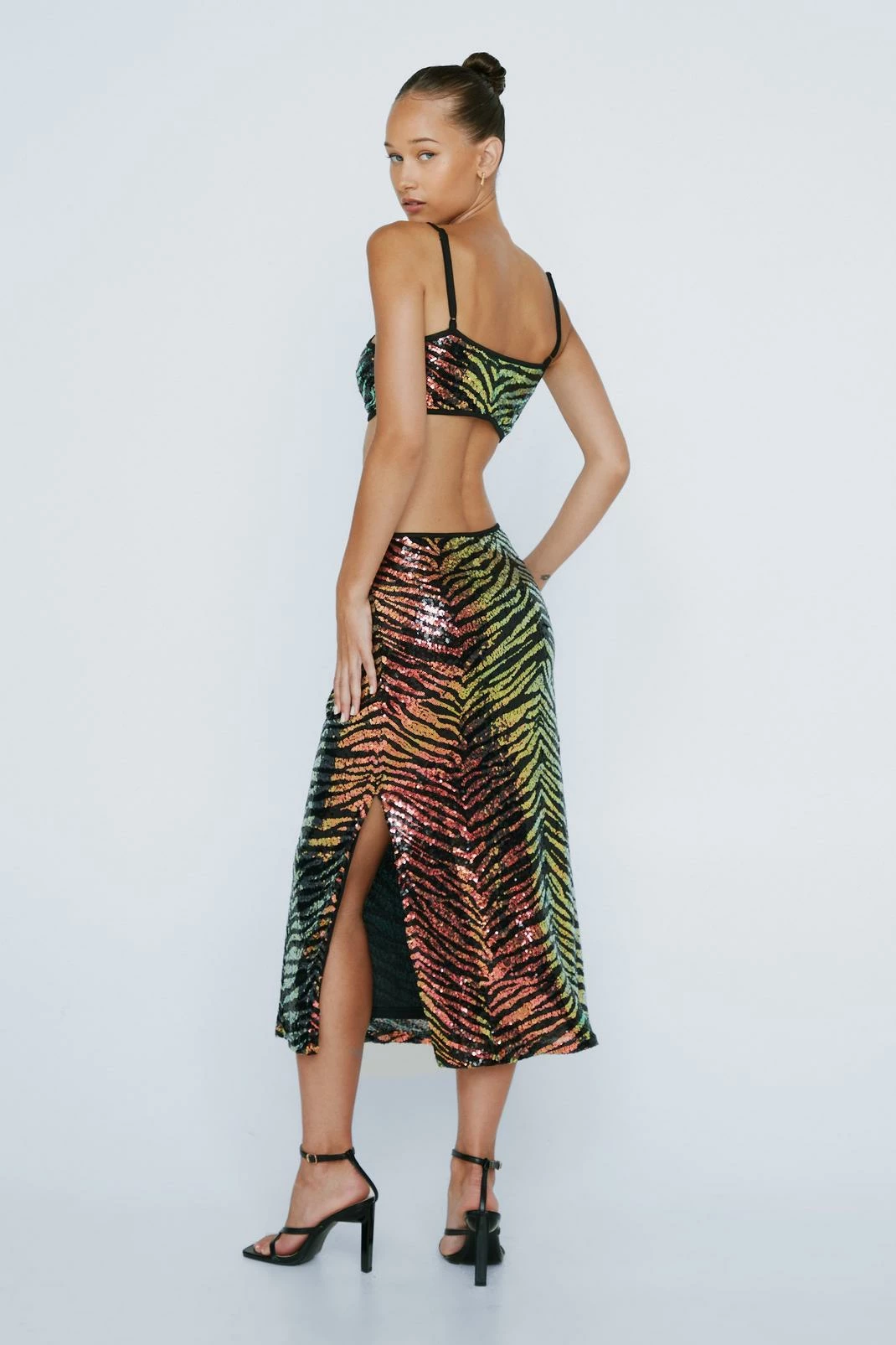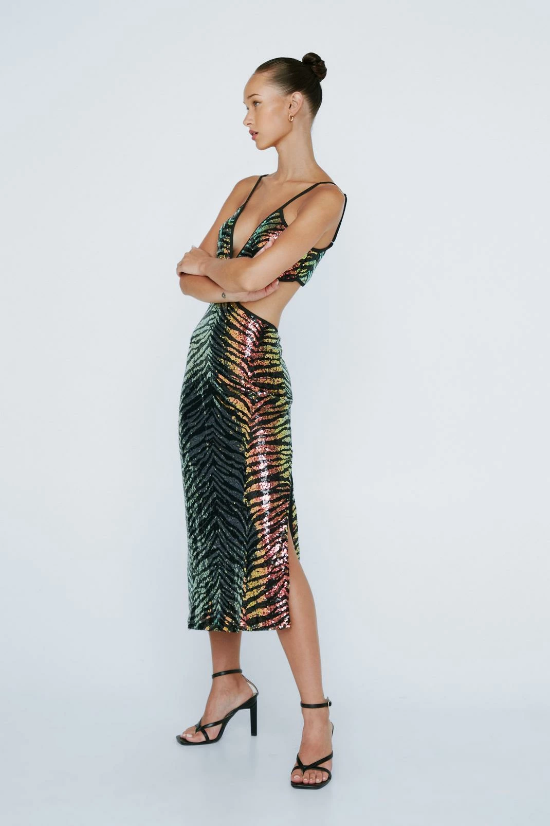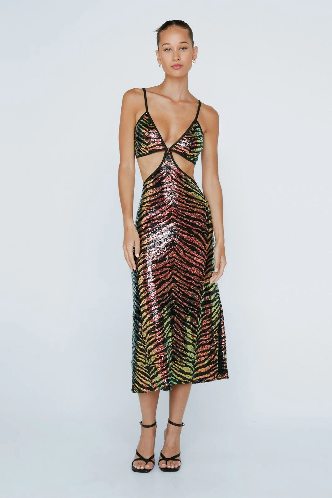 Wild nights pending. Feel fierce in our midi dress, made in high quality sequin fabric, with a fun zebra print and a sexy cut out design. Style with strappy heels for a look that will turn heads, whether you’re wearing it to prom night or to a party.