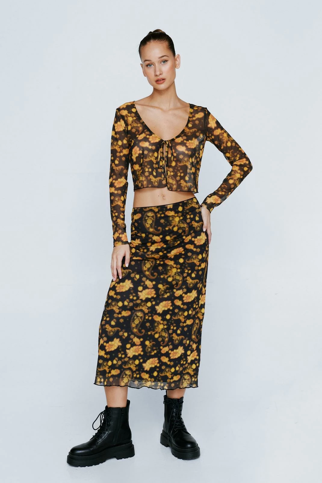 In bloom. Feel feminine in our tie front top, with a subtle floral print, a flattering relaxed fit, and a flirty open design. Pairs well with the matching maxi skirt for an interseasonal look that is perfect for going from dinner dates to happy hour.