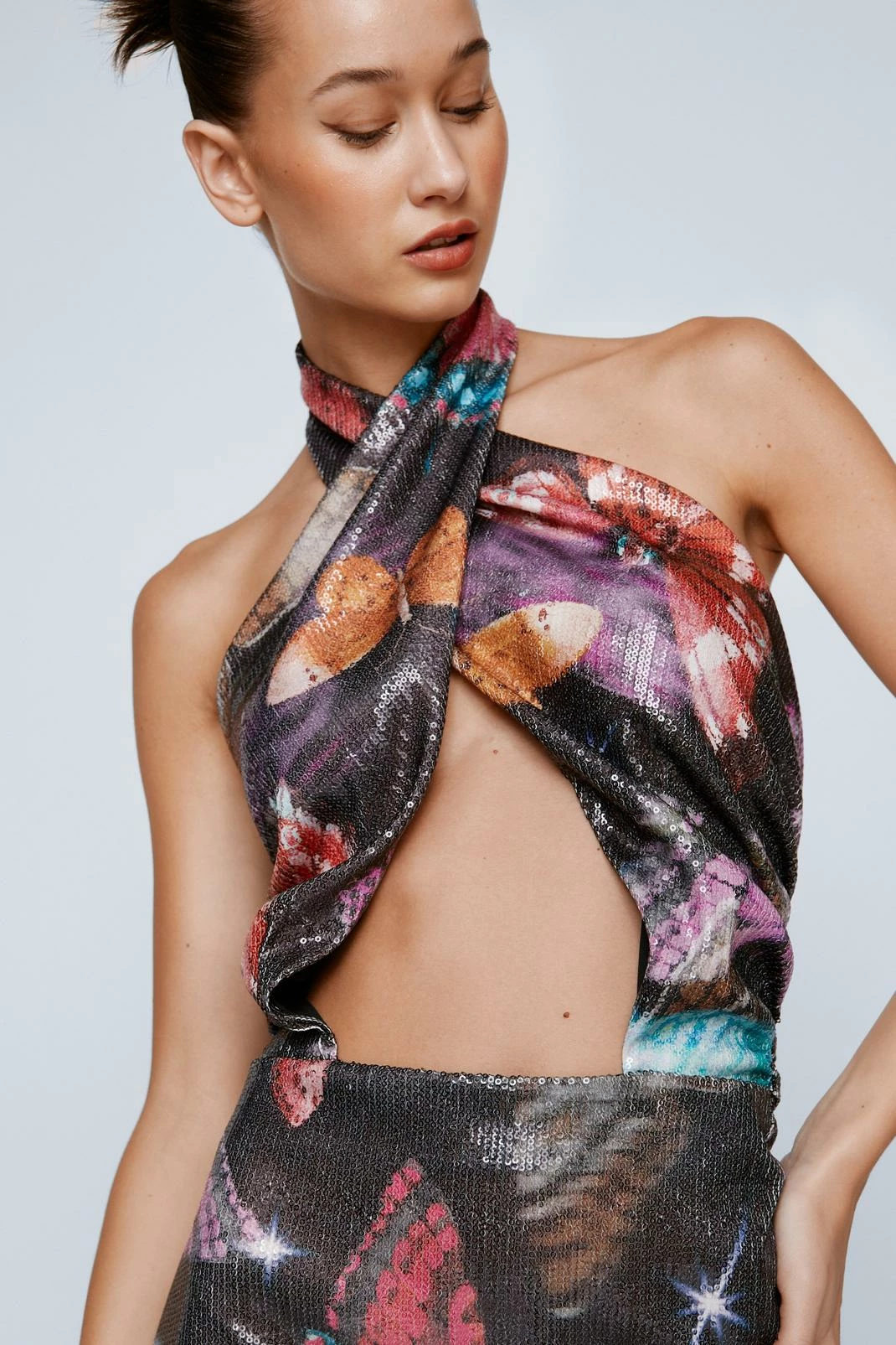 Spread your wings. Our petite printed butterfly midi dress features sequin fabric and a halterneck design for a daring party look.