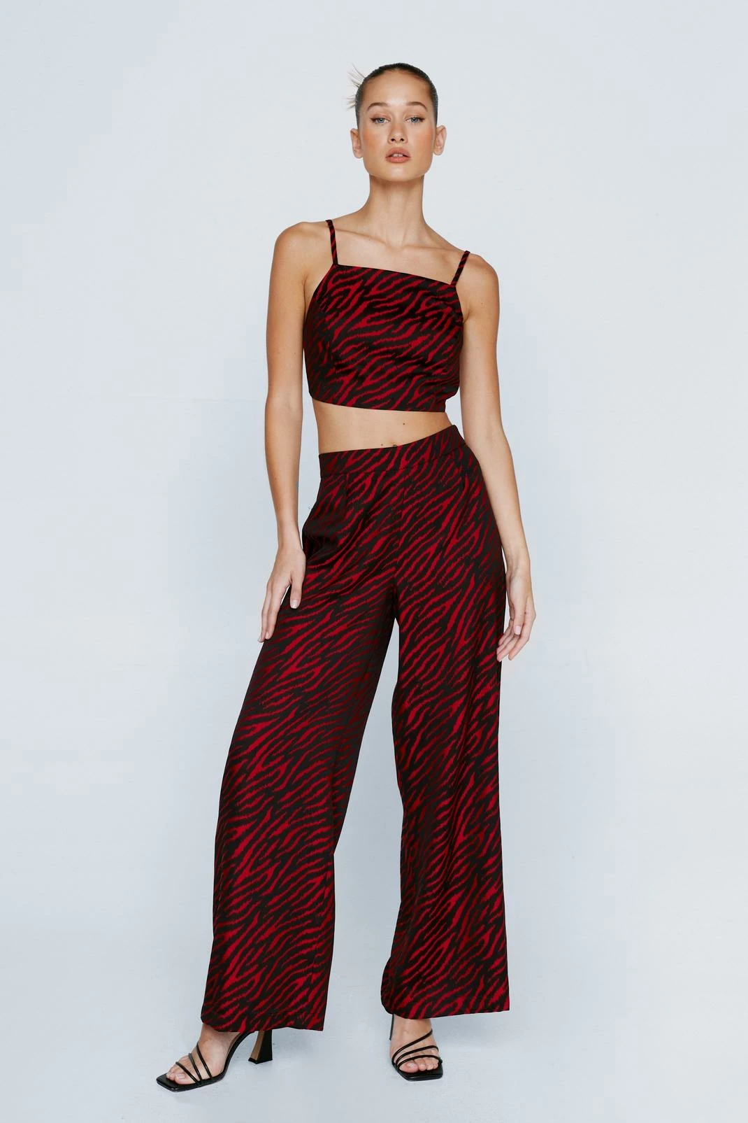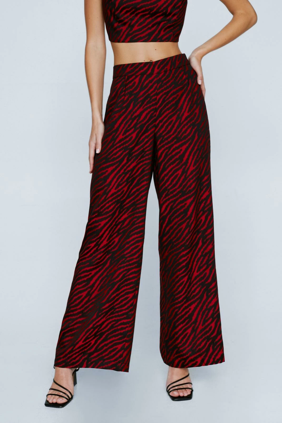 Down here. Feel confident in our wide leg pants, with a classic zebra pattern, a high quality jacquard fabric, and a comfortable high waistline. Pairs well with the matching crop top and strappy heels for an instant occasion look that you’ll love to keep coming back to, whether you’re searching for a date night look, an elevated office outfit, or are heading out for drinks with the girls.