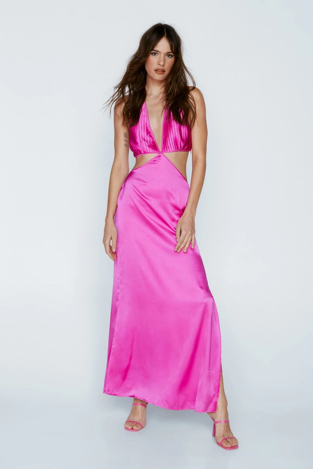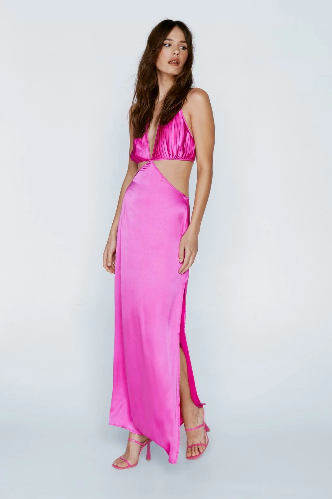 A moment for the dress. Feel glamorous in our occasion dress, with a dramatic plunge neckline, textured pleated bust details, and flirty cut outs and a leg split feature. Pairs well with chunky heels and strappy heels for a showstopping occasion look, perfect for prom, homecoming, wedding guest looks, and all of your upcoming occasions.