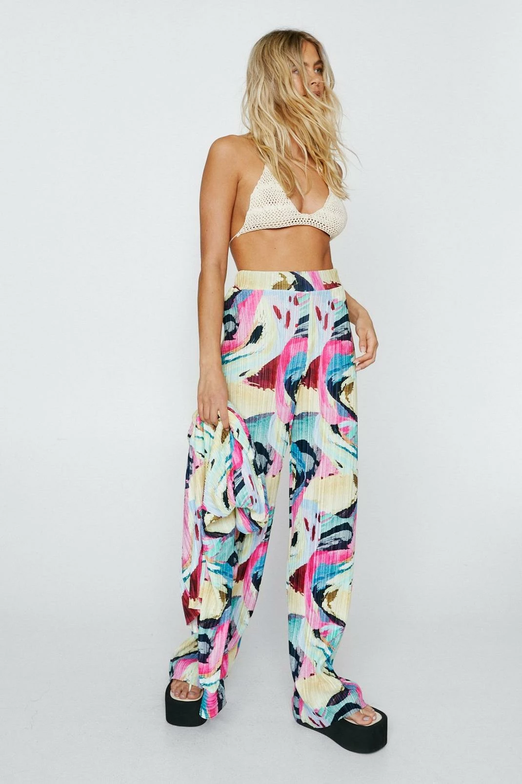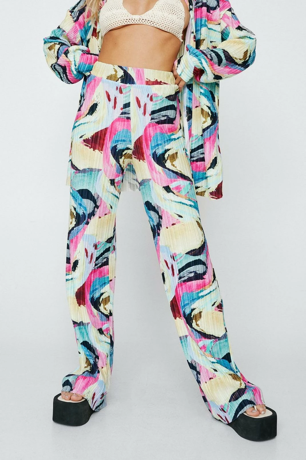 - Plisse Abstract Print High Waisted Pants