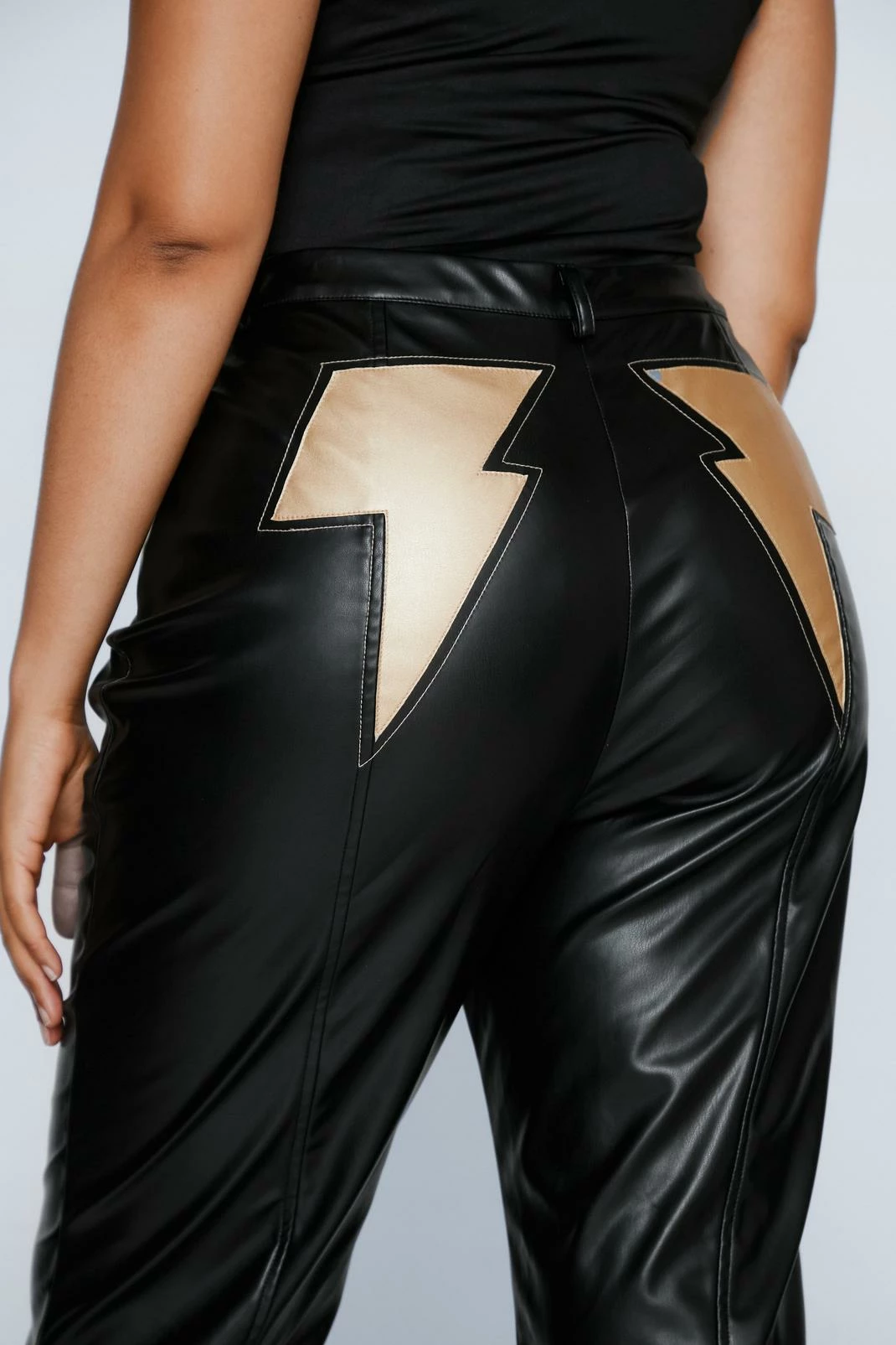 Turn heads. Feel fierce in our flare pants, made in high quality faux leather, with a stellar flared silhouette, a flattering high waistline, and statement lightning bolt patches. Pair them with a crop top or corset top for a look that will take you from festivals to date nights and happy hours.