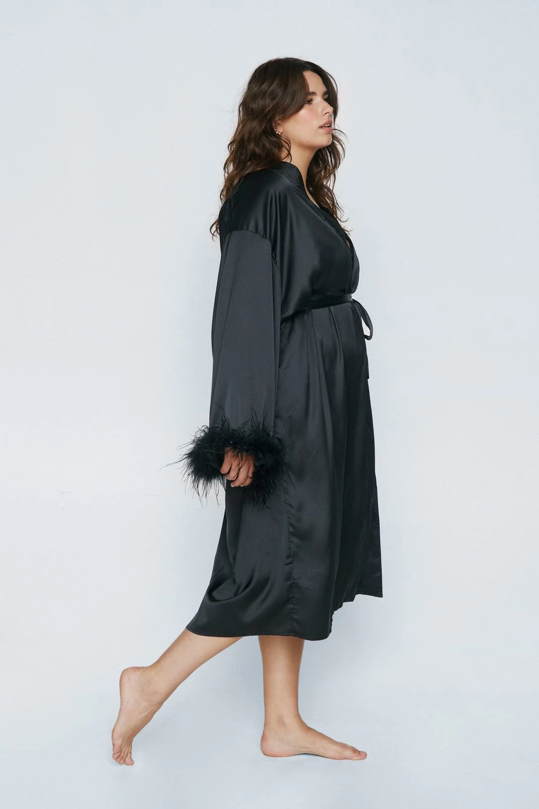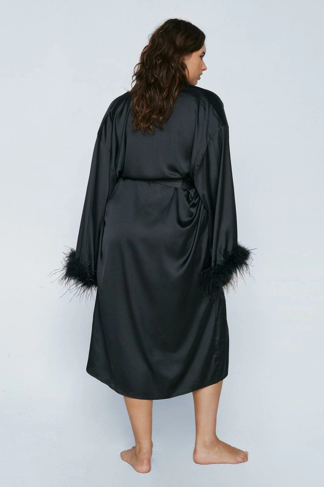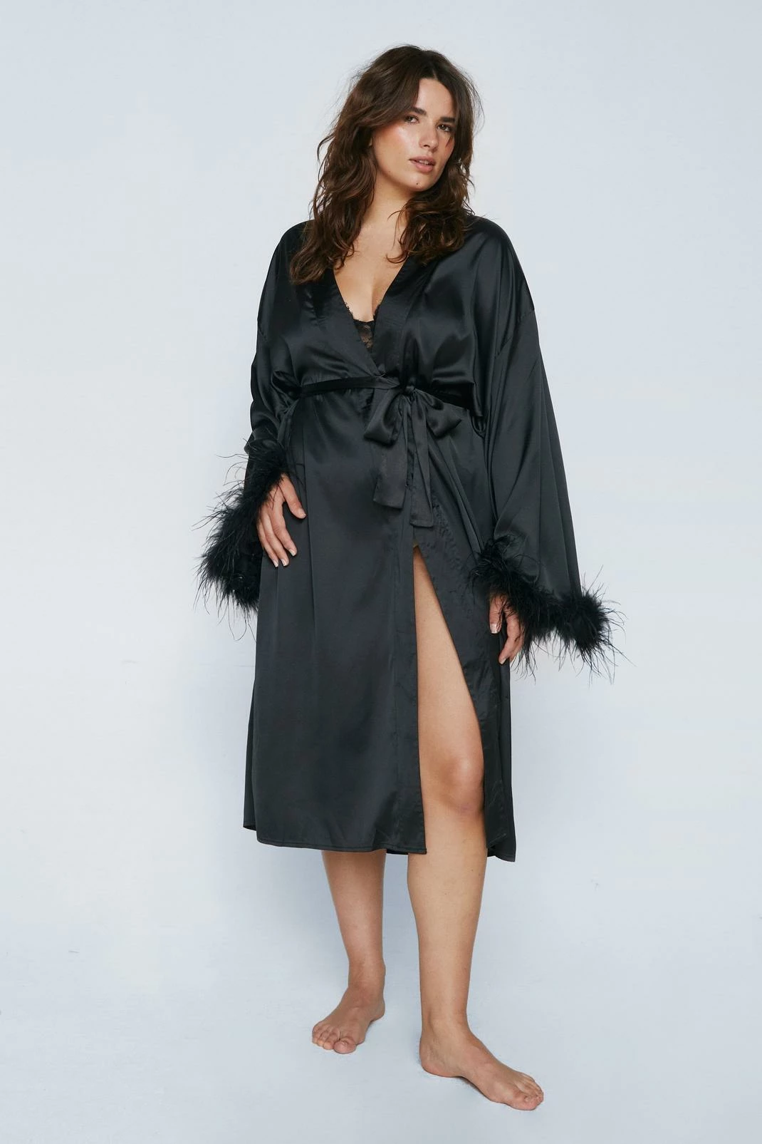 Wrap it up. Feel sultry in our plus size robe, which features a flirty feather trim, high quality satin fabric, and an ultra flattering midi length. Pairs perfectly with self-care evenings and duvet days.