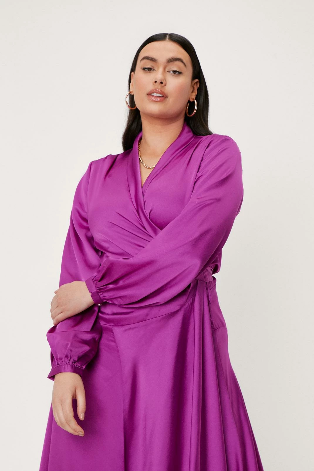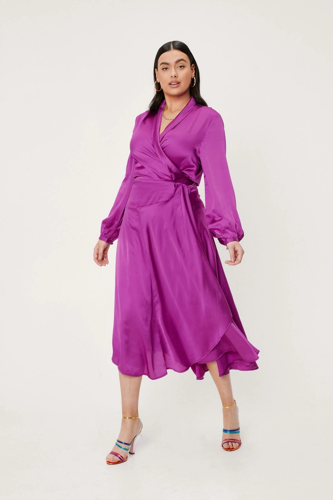 So you said you’d go… This dress comes in satin and features a V neckline, relaxed, midi silhouette, wrap design, slit at front, blouson sleeves, elasticized cuffs, knot detailing at front, bow tie closure at back, belt loops, and uneven hem. Model is 5’8″ and wears a US size 6/UK size 10.