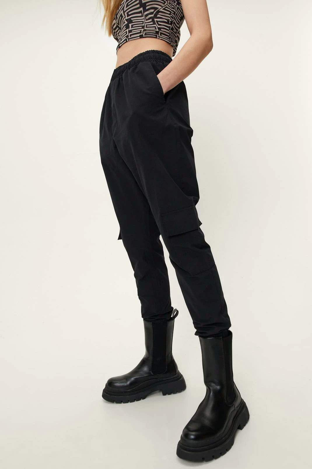 Hard-working hero. These cargo pants are a reworked 90’s staple that come in a thick, woven fabric. They feature an elasticated high waistband, relaxed silhouette, flap pockets at legs, deep pockets at sides, cuffed hems, and pull-on design. Team these practical pants with chunky Chelsea boots and an oversized blazer for sophisticated daytime dates.
