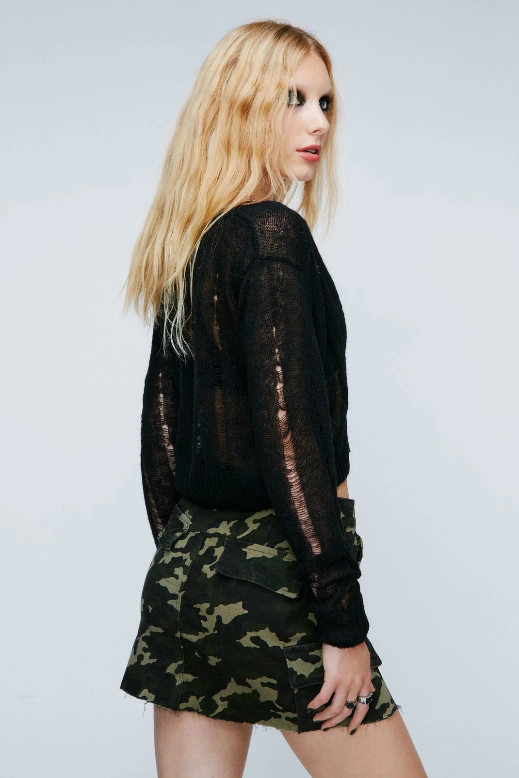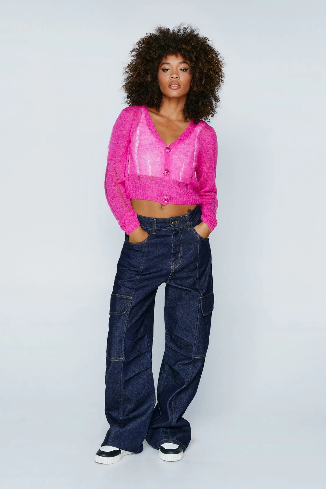 Button it. Feel confident in our cropped cardigan, made in high quality sheer fabric, with eye catching laddered detailing, and a button fastening. Pairs well with mini skirts and leather pants for an elevated look that will take you seamlessly from day to night, perfect for hitting up happy hour, layering up in the office, and heading for drinks.