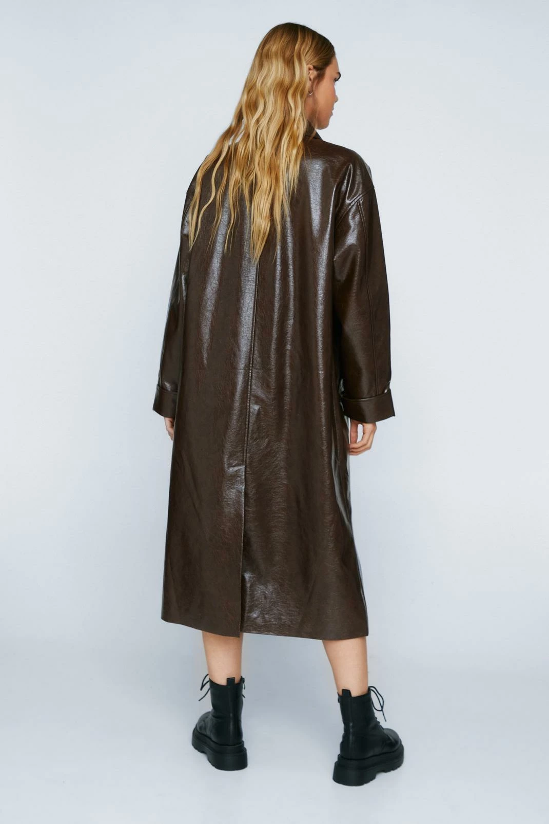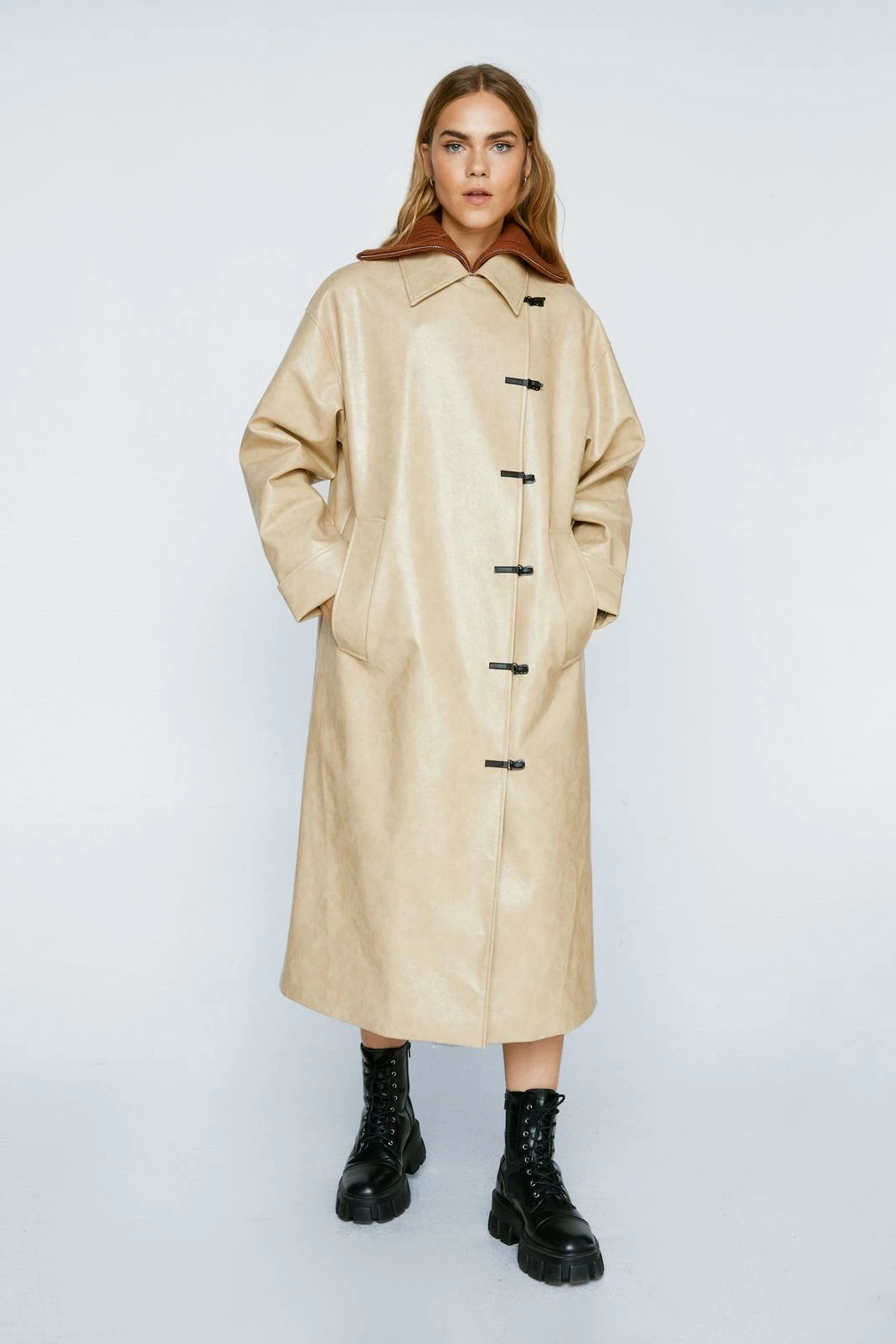 Coat conditions. Our premium faux leather vinyl coat has fun toggle fastenings and a longline design to keep you feeling cozy. Style over your favorite cold weather outfits to be protected from the elements.