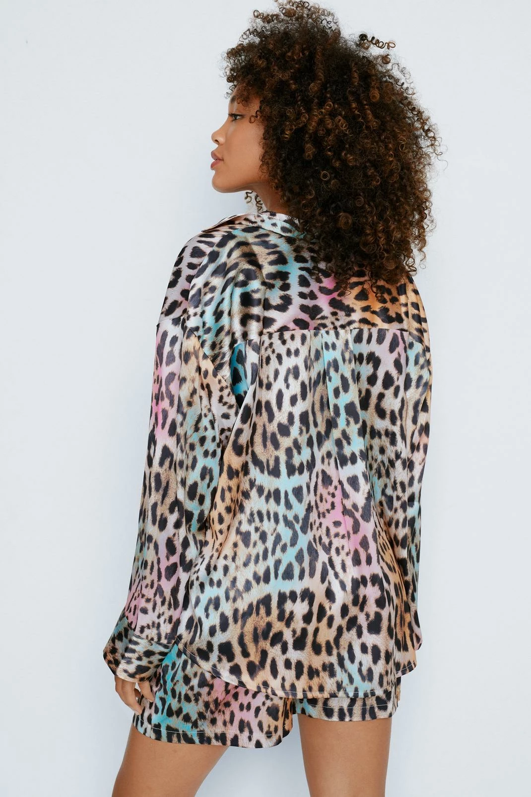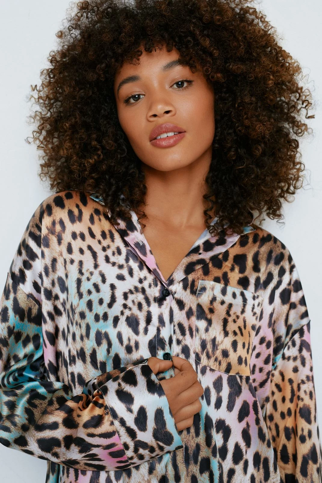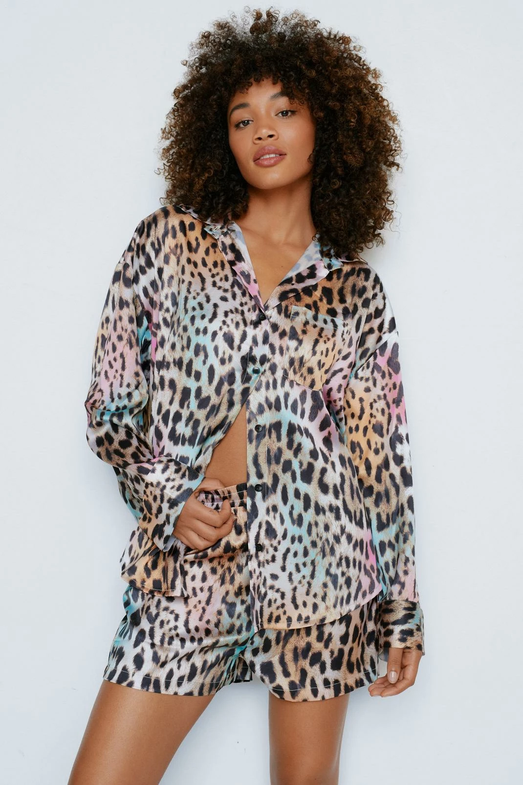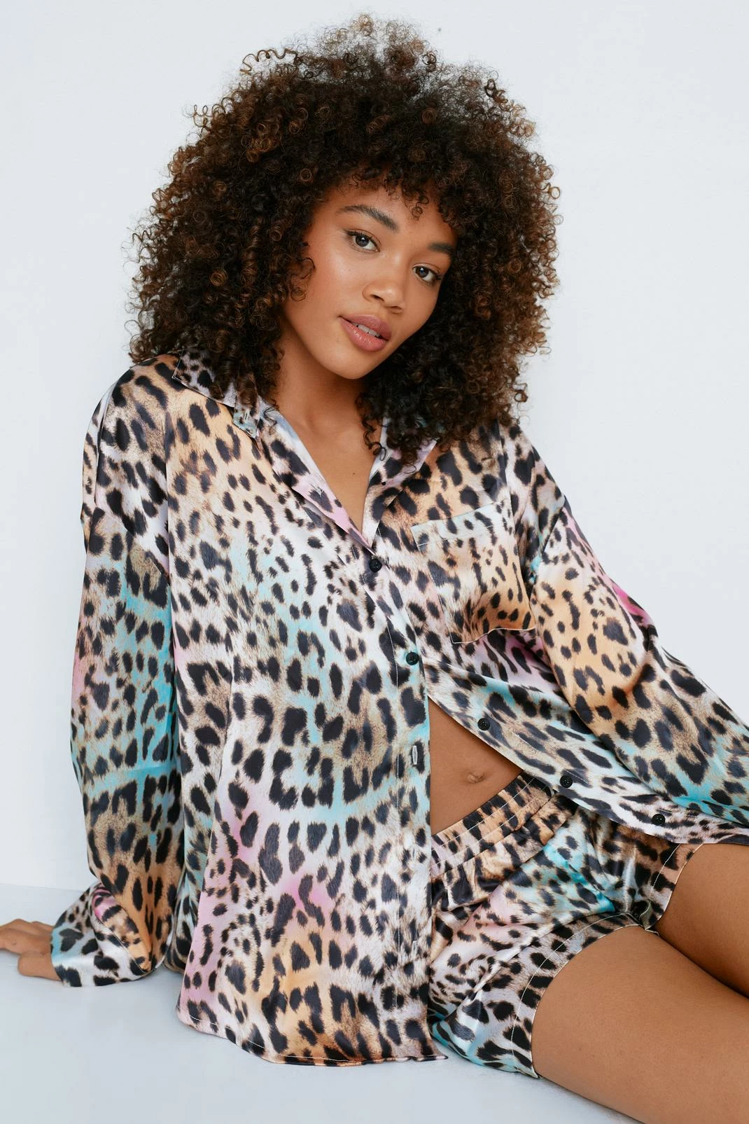 Hear her roar. Bring the jungle to the bedroom in our satin leopard print PJ set.