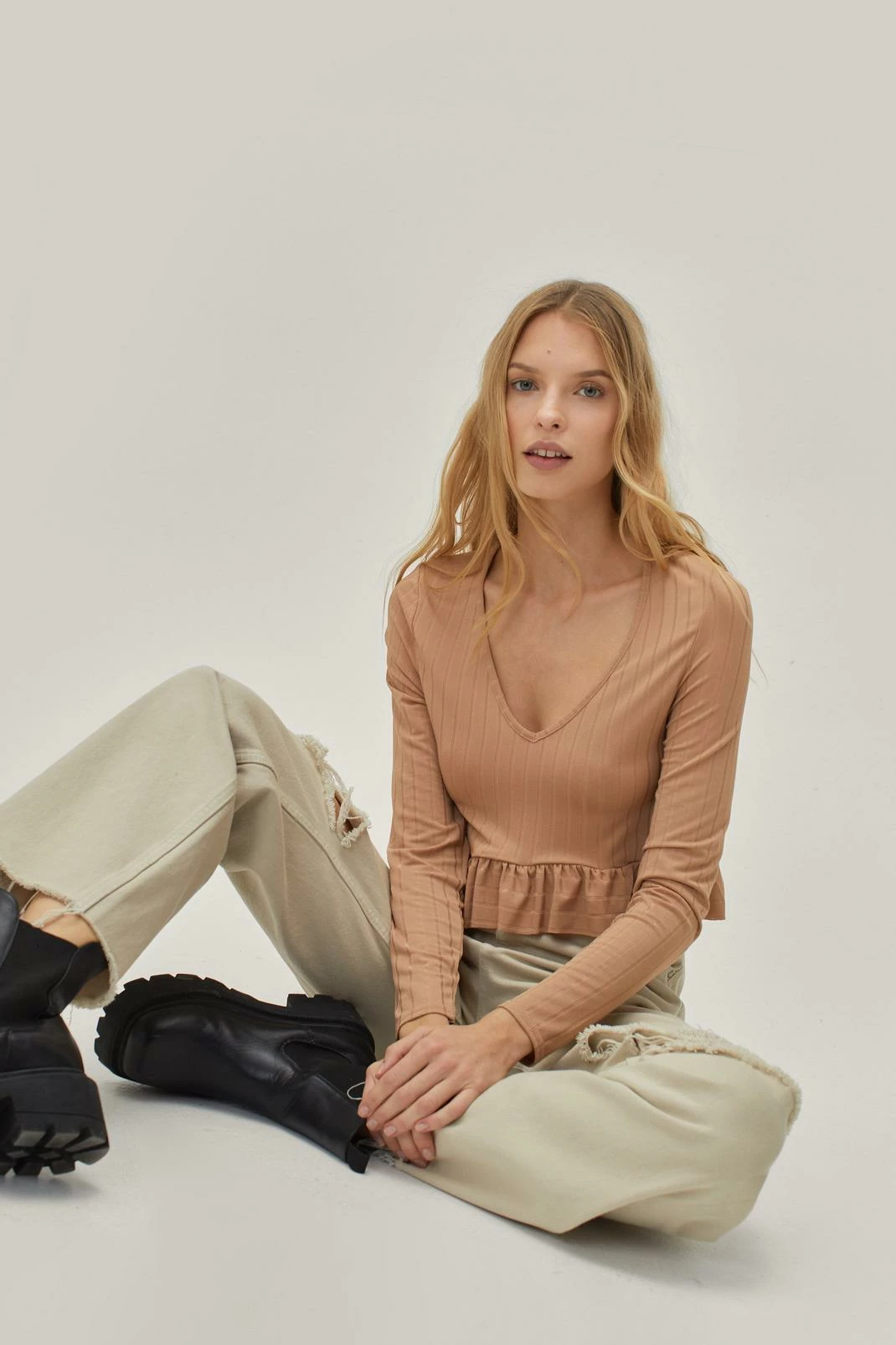 Ruffle and ready. This crop top comes in soft, breathable fabric and features a comfortable relaxed silhouette, a cropped cut that falls just above the waist, long sleeves, a wide scoop neckline that shows off your décolletage, and ruffle hem detail. Pair with wide leg jeans and heeled boots.