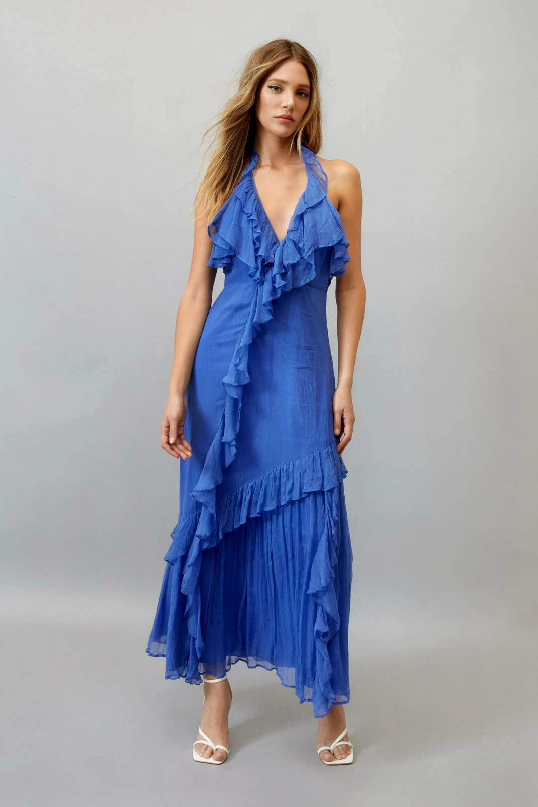 A moment for the dress. Feel fancy in our maxi dress, with fun ruffle detailing which creates beautiful movement, a halter neckline, and backless design. Pairs well with strappy heels for a failsafe occasion look.