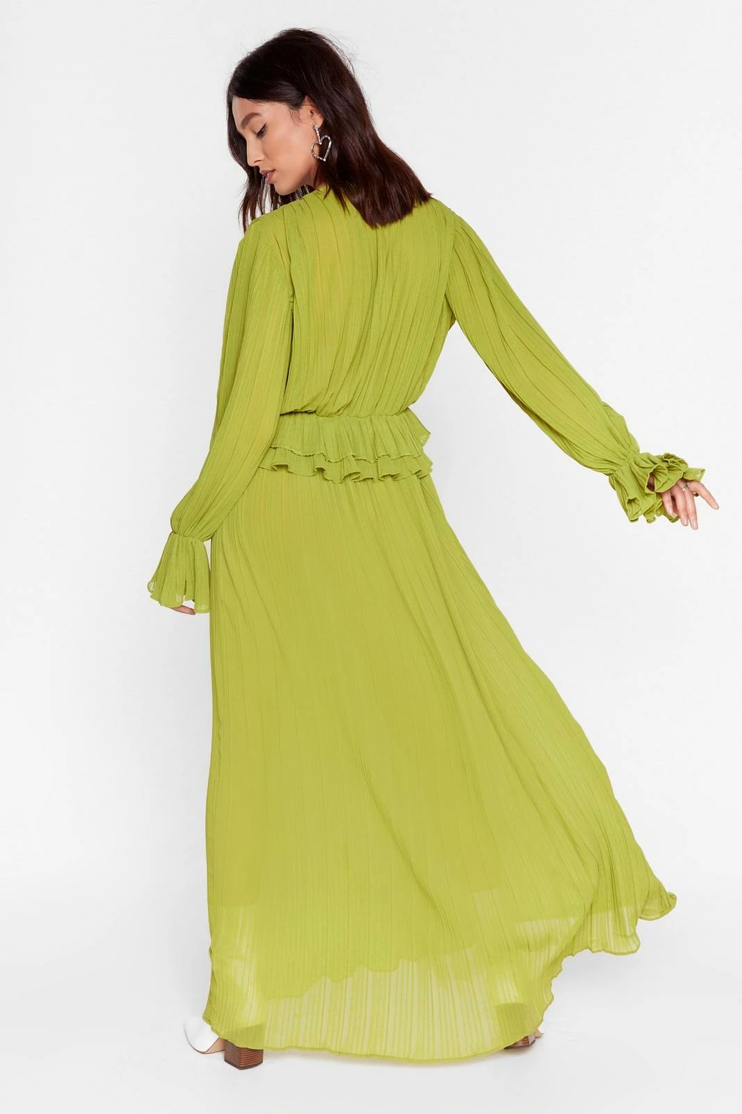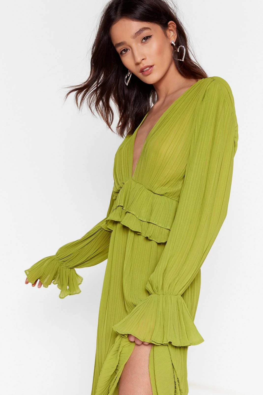 For when plans turn into formal affairs. This effortless evening gown comes in a textured, woven fabric which features a loose silhouette, plunging V neckline, long balloon sleeves with fluted cuffs and ruffle detailing, ruffles at waistline, maxi hemline with daring knee high split, pleated design throughout, and zip down closure. Contrast yours with dark leather Chelsea and playful western boots.