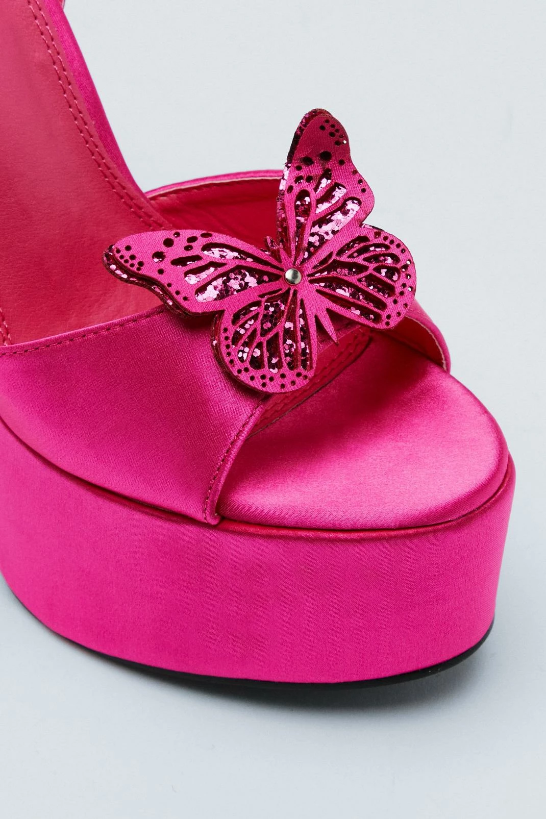 Fancy footwork. Feel fierce in our platform heels, with high quality satin fabric, an extreme chunky platform heel, and a butterfly accent. Pairs well with maxi skirts, dresses, and jeans for a look that will take seamlessly from day to night, from happy hours to dinner dates and drinks.