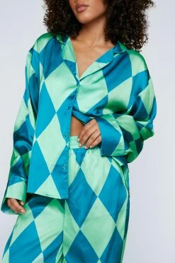 Block it out. Feel luxe in our satin pajama set, with a fun diamond pattern, a relaxed, oversized shirt, and wide leg pants. Perfect for lazy days and self care nights.