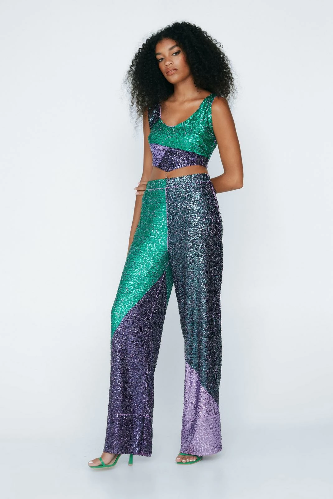 Down here. Feel fierce in our wide leg pants, with a high quality sequin fabric, an ultra flattering wide leg fit, a comfortable high waistline, and an attention demanding color block pattern. Our sequin pants pair perfectly with the matching corset top, perfect for wearing to parties, or hitting up discoball dancefloors.