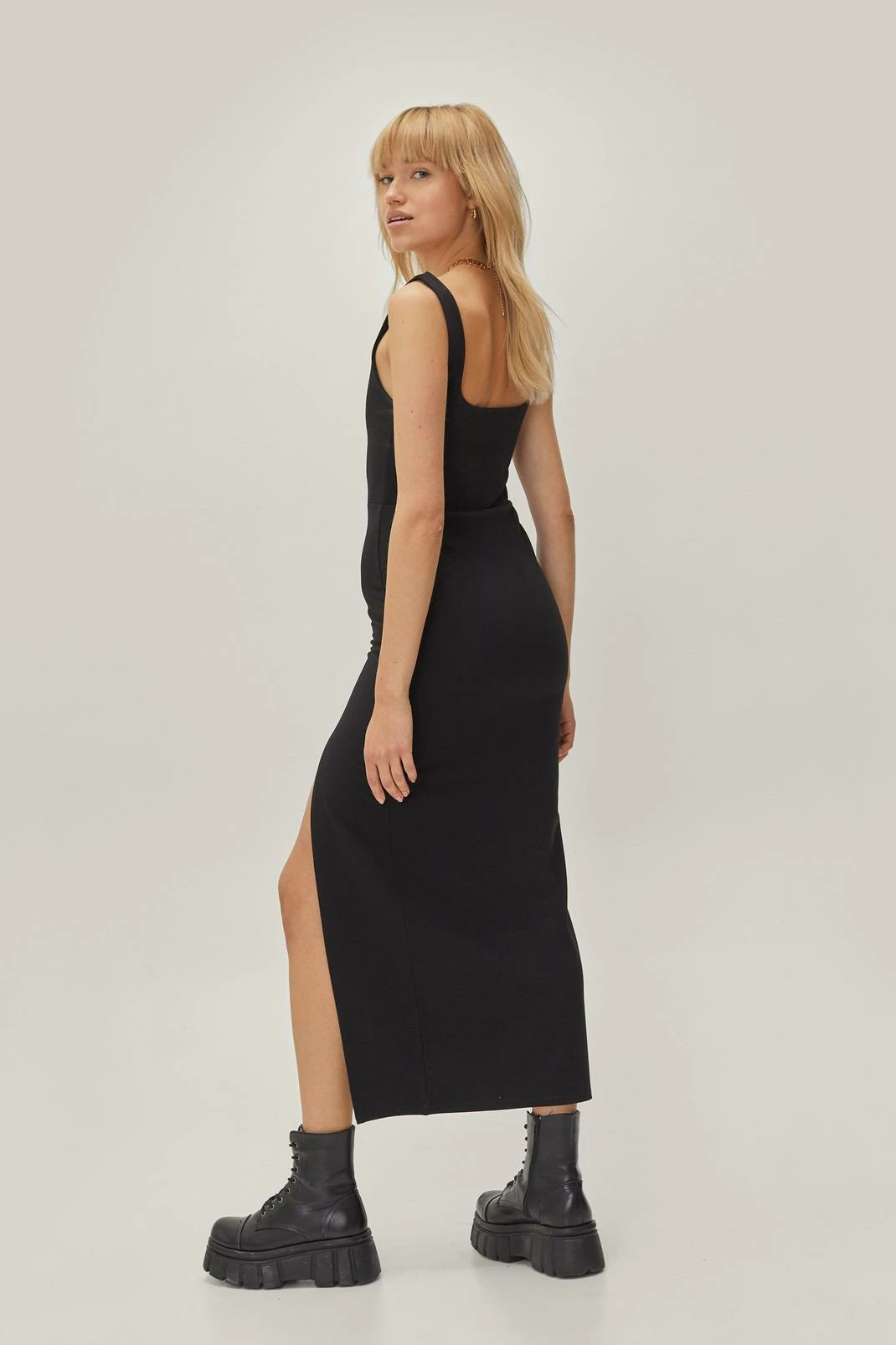 This dress comes in a fabric and features a square neckline at front and back, sleeveless, bodycon, midi silhouette, split hem at front, and stretch fit throughout. Style up yours with chunky biker boots.