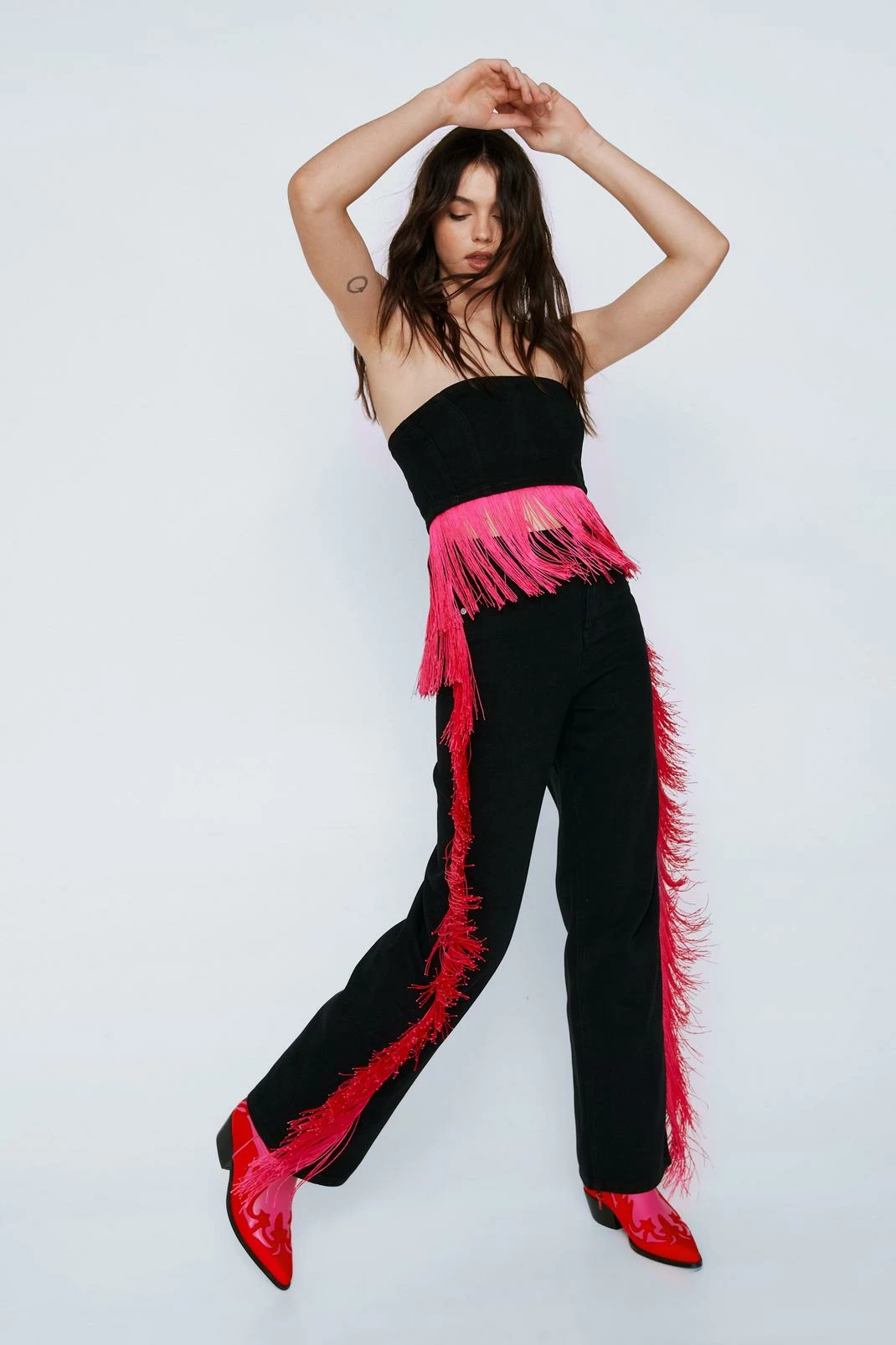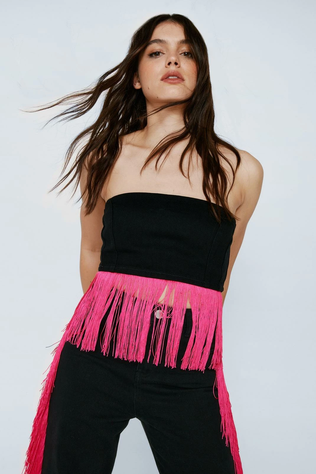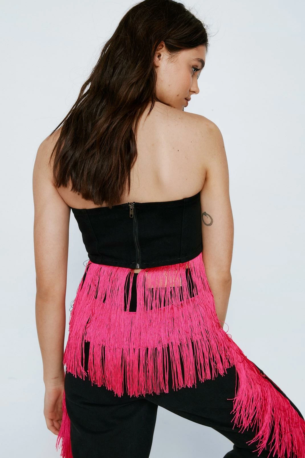 Shake it off. Our fringe corset bandeau top will have you feeling fun and flirty. Pairs perfectly with the coordinating pants and your go-to cocktail.