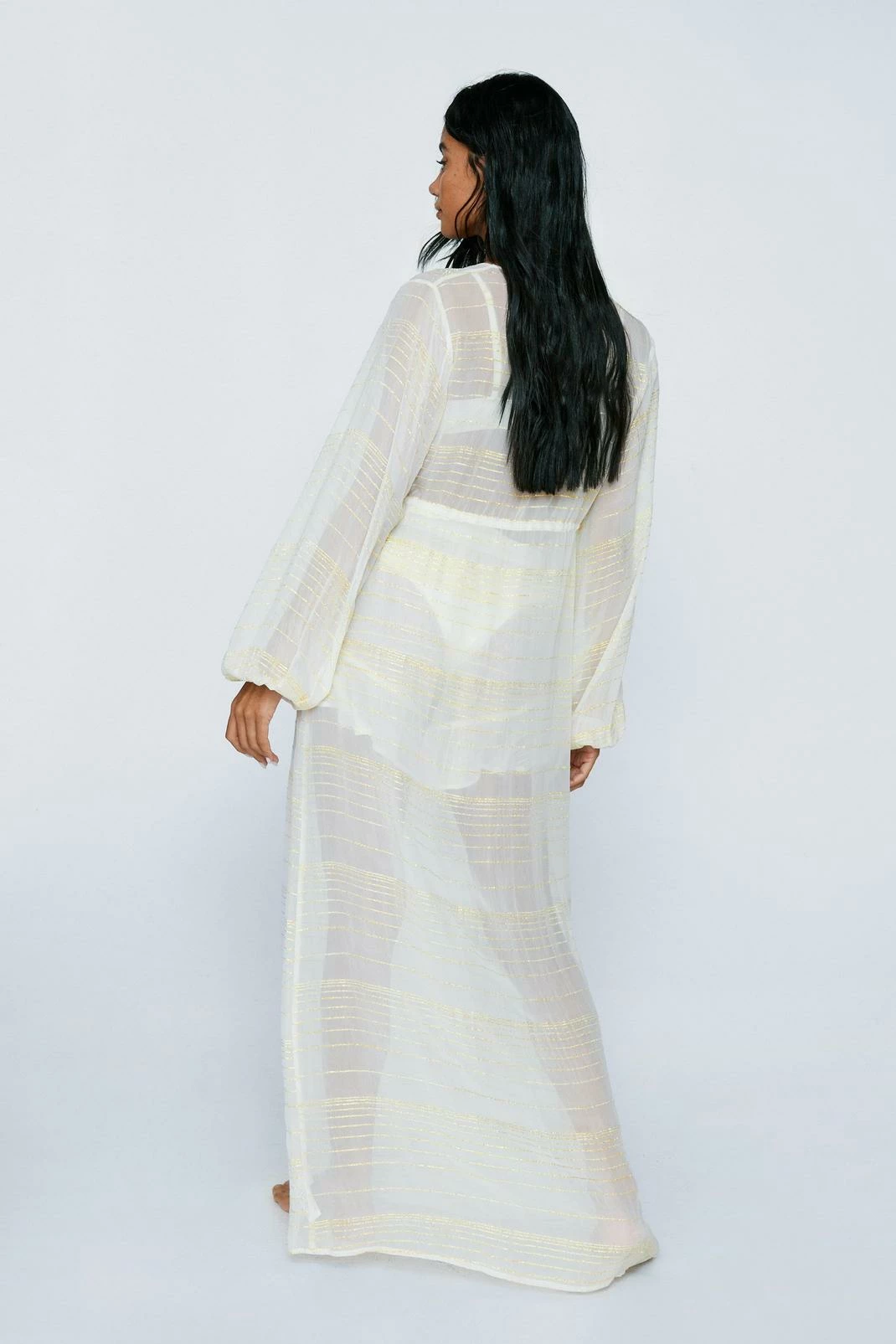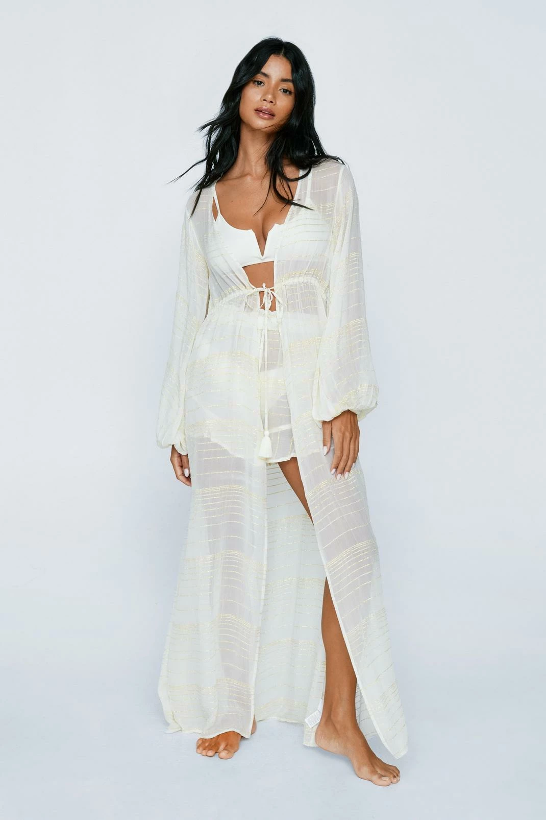 Catching rays. Feel glamorous by the poolside in our cover up kimono, made in high quality georgette fabric, with sparkling glitter stripes, a tie waist fastening, and fun balloon sleeves. Pairs well with your fave swimwear and the matching separates for a head turning poolside look, perfect for building up your vacation closet.