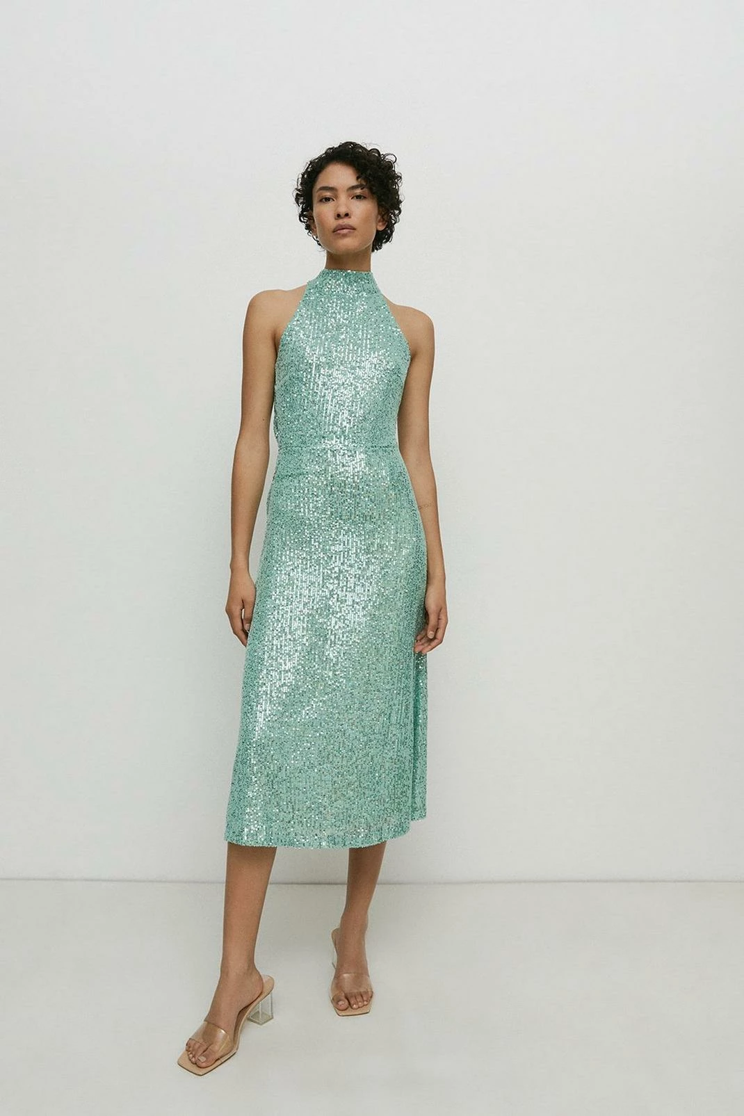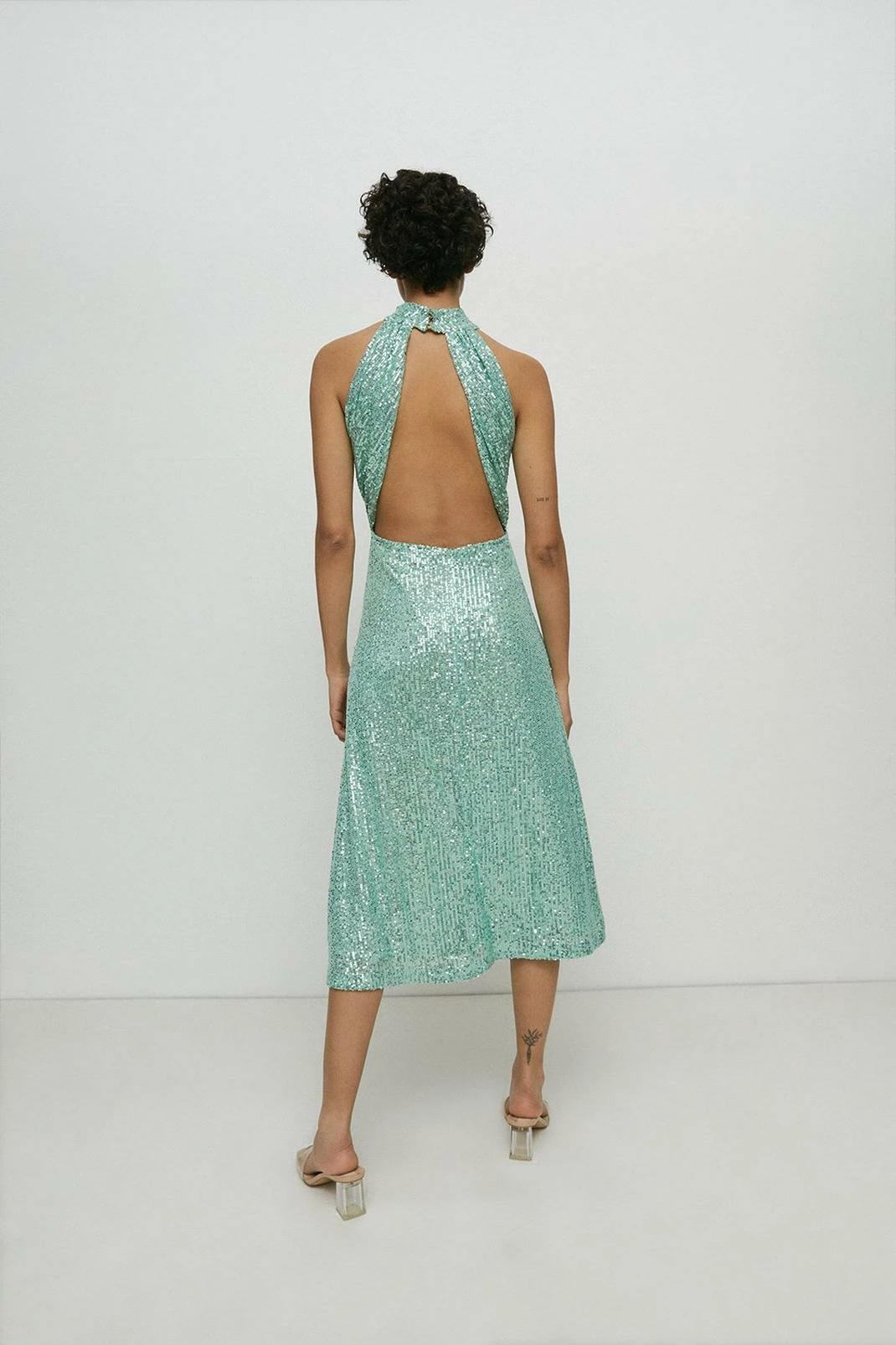 - Warehouse Sequin Halter Drape Back Midi Dress